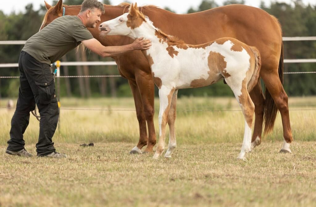 Nach dem Absetzen sucht dieser absolute Eyecatcher ein neues Zuhause. Hugo ist ein bildhübsches Paint Horse Hengstfohlen mit toller Zeichnung und sehr korrektem Körperbau. Er wurde 4.22 geboren und wird ein geschätztes Endmaß von 158 cm bekommen. Das Fohlen besitzt einen sehr aufgeschlossenen Charakter, kommt zum Menschen und lässt sich gerne streicheln und händeln. Kennt den Hufschmied und Tierarzt. Bei Abgabe beherrscht er das Fohlen ABC. Hugo wächst in einer Herde mit Stuten und gleichaltrigen Fohlen unter besten Bedingungen auf. Das Fohlen hat jetzt schon eine sehr ausgeprägte Muskulatur, starke Gelenke und kräftige Beine. Außerdem zeigt er sehr gute Bewegungen. Hugo ist ein Sohn vom Multiple European Halter Champion, Futurity &Maturity Champion + APHA Honor Roll (BEST IN THE WORLD) Open 2 year old Halter Stallion Whataholic, ein Whatafrecklynxkent Sohn. Die Mutter vom Kleinen ist eine Tochter vom DQHA Platin Hengst Dressed By Red und eine Enkelin vom Zippos Mr Good Bar. Also sehr gutes Allround Blut. Er bringt beste Voraussetzungen für den Turniersport mit, aber auch ideal als cooler Partner für die Freizeitgestaltung.