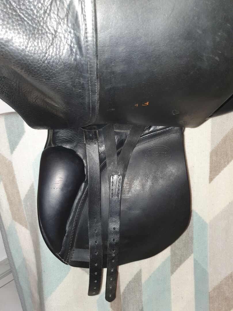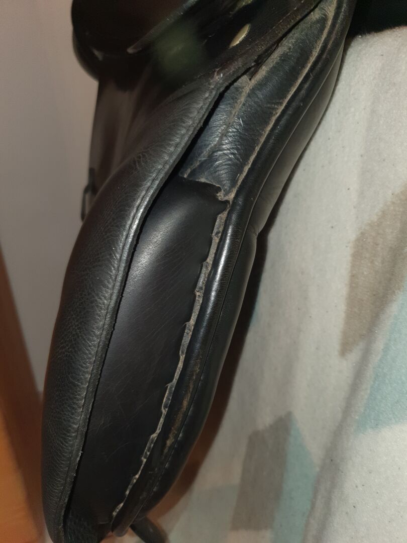 Welche Arbeiten zurückliegend an dem Sattel vorgenommen wurden entzieht sich meiner Kenntnis, ebensowenig kann ich reinschauen. Optisch macht er einen ordentlichen Eindruck, das schwarze Leder ist gepflegt, keine Löcher, Risse oder grobe Macken bis auf eine im linken Sattelblatt, siehe Bild. Meinem Empfinden nach hat er recht viel Polsterwolle drin und die Polsterung fühlt sich nicht knotig an. Der Wirbelkanal ist recht breit. Die Kammer müsste mittel sein.