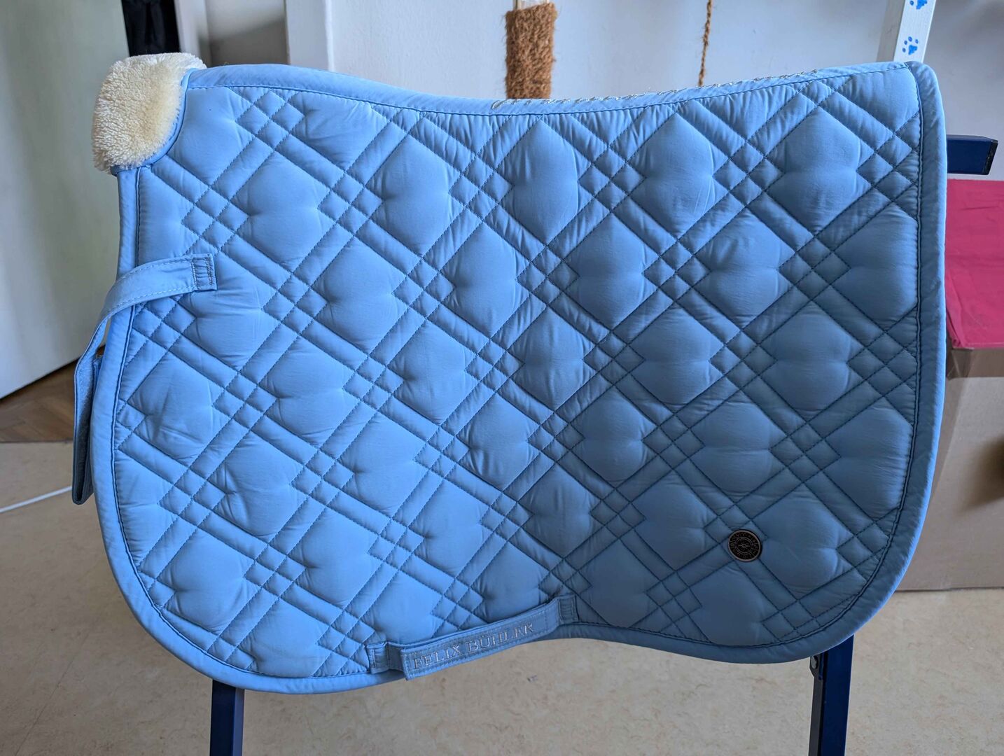 Blau ist ein schönes Hell-/Babyblau mit Glitzereffekt. Eine aufgenähte Münze mit den Sternzeichen zieren die Schabracke und die Haube. Der Stoff ist Baumwollartig.