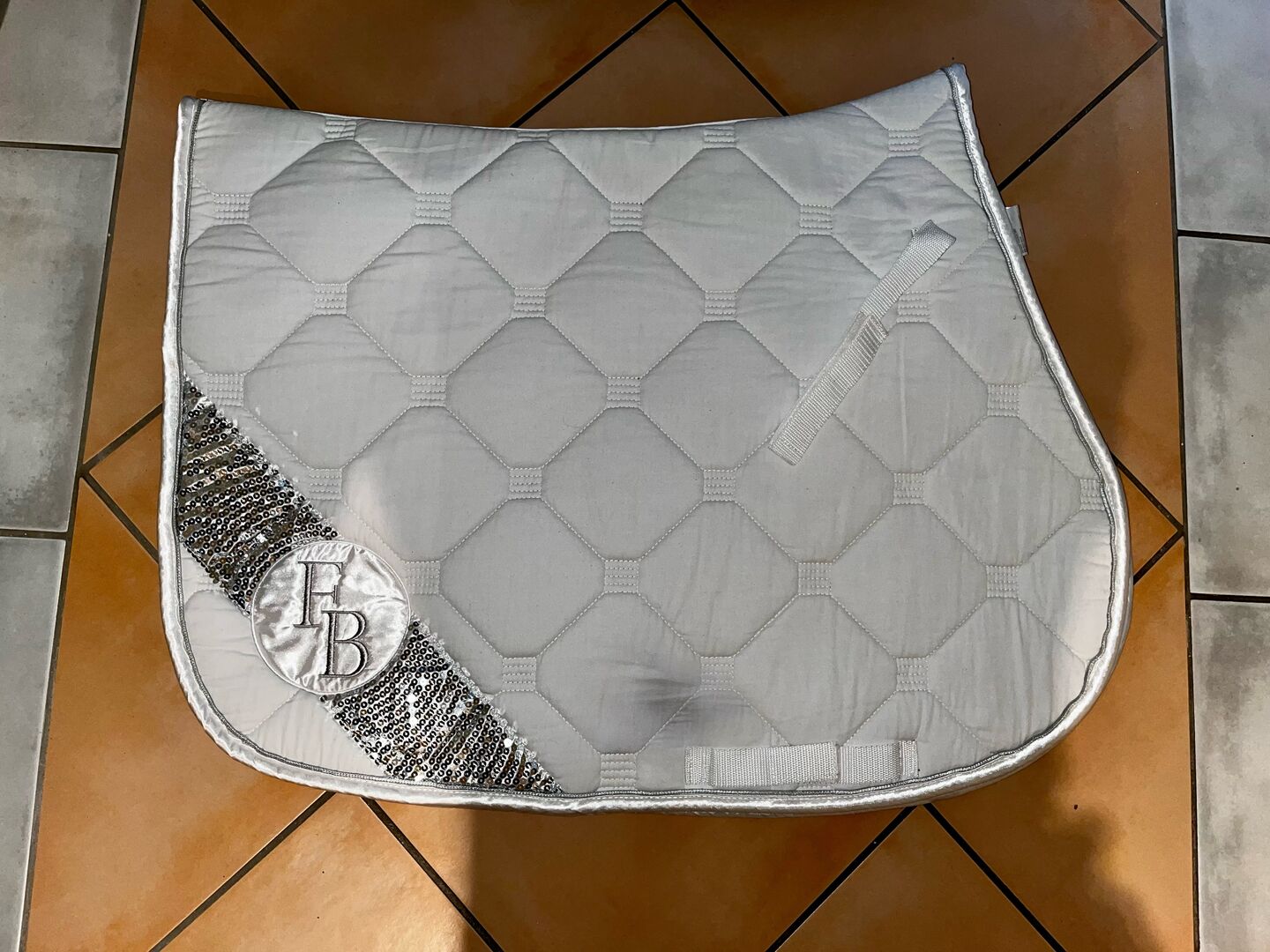 Felix Bühler Schabracke WB/VS weiß mit Glitzer. 2x benutzt, leichte Spuren vom Sattelgurt an der Schabracke (sieht man aber nicht, da sie unterm Gurt liegen).