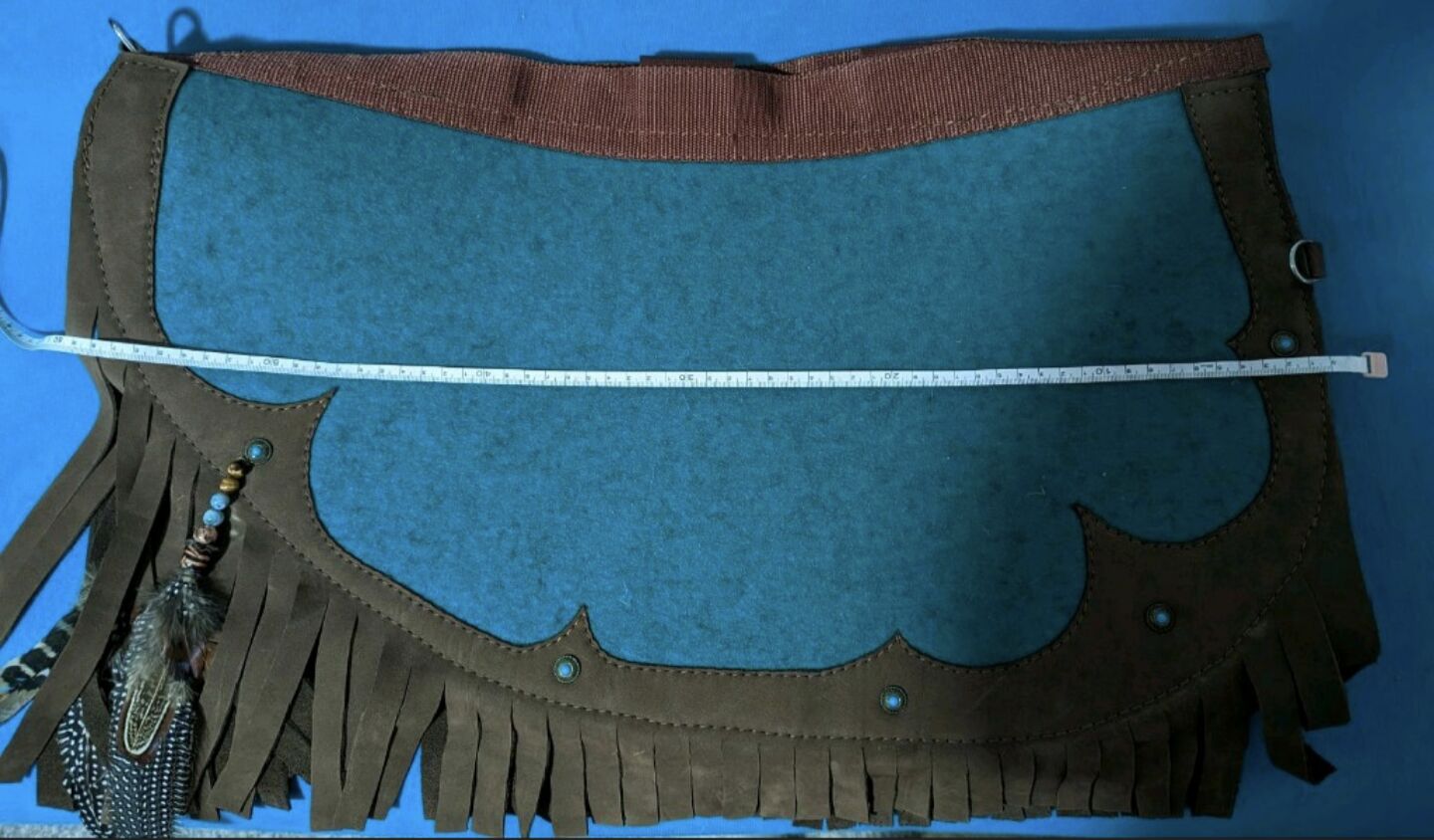 Rückenlänge auf der Wirbelsäule beträgt 56cm, die Sattelblatt Länge ohne Fransen 34cm, mit Fransen 39cm, seitlich gemessen, siehe Bild Nr.4 59,5 cm.