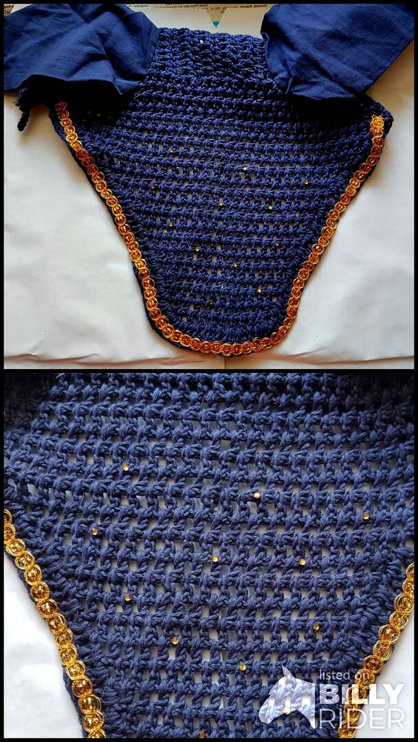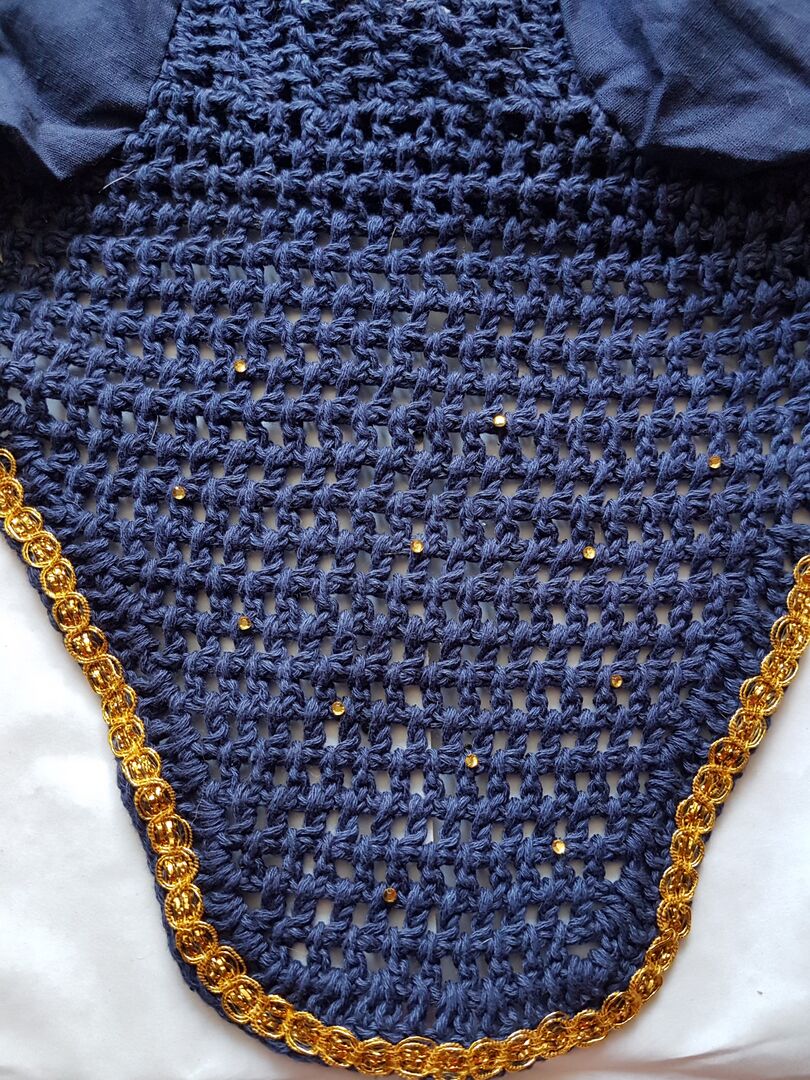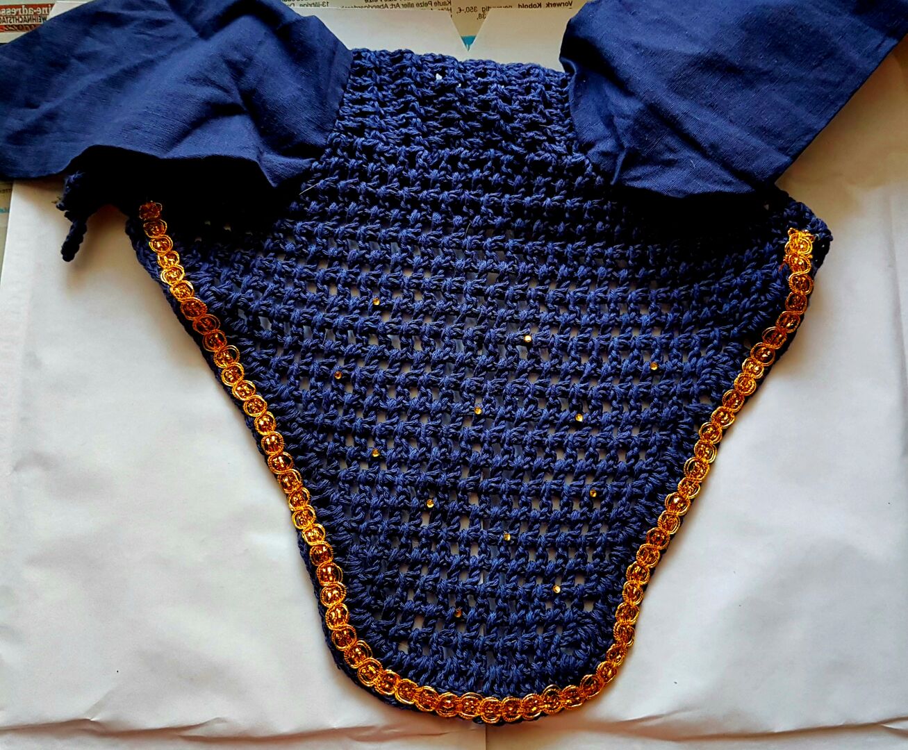 Verkaufe diese Blau-Goldene Fliegen-Haube in Größe Warmblut. Sie ist Marieneblau mit goldenen Strasssteinen. Auf Wunsch können auch mehr und größere Steine oder Pailletten zum verglitzern verwendet werden.