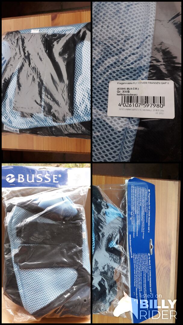 Verkaufe eine Fliegenmaske Fly Cover mit Fransen von Busse. Hellblau / schwarz. Neu und Originalverpackt. Die Maske ist aus engmaschigem Netzgewebe mit umfangreichem Platz für die Augen gefertigt, Ohrenschutz aus weichem, elastischen Nylon Material, mit fixierten Fransen im Nüsternbereich. Alle Ränder sind mit weichem Fleece eingefasst. Mittels zwei breiten Klettverschlüssen an der Unterseite zu schließen. Mit Öffnung für den Schopf. Größe: XWB (Warmblut, extra groß) Privatverkauf, keine Rücknahme oder Garantie. Versand möglich, Kosten zu Lasten des Käufers Zahlung per Überweisung oder Paypal