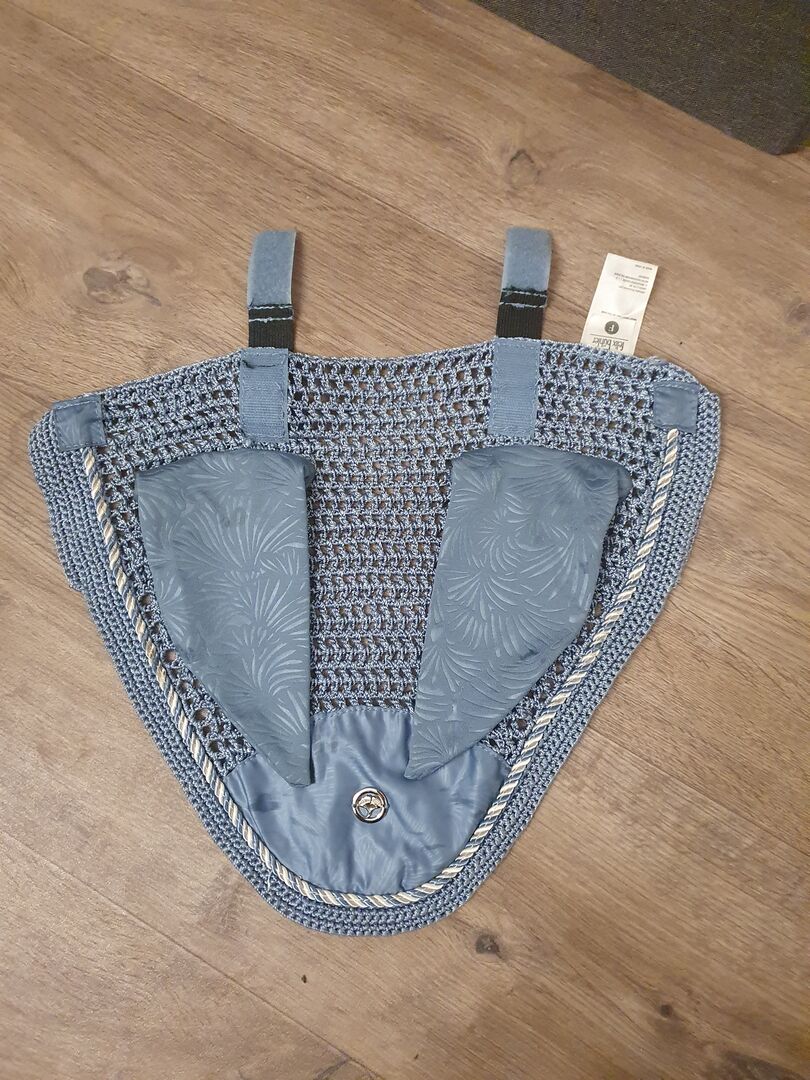 Fliegenohren von Felix Brühler. Nur einmal benutzt und nicht wieder. Sie ist mit einem Klett versehen, welche man am Nagenstück der Trense befestigen kann. Sehr hübsches Design. Die Farbe ist Hell-blau-grau.