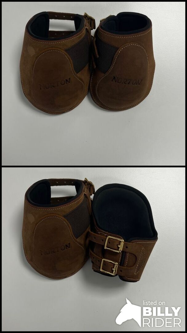 Reitgamasche für hinten mit weichen Neopren Innenfutter in schwarz und festerem Büffelleder in braun außen. Die Gamaschen verfügen über eine Verschluss mit Schnallen und einem robusten Gummiband für einen guten Halt.