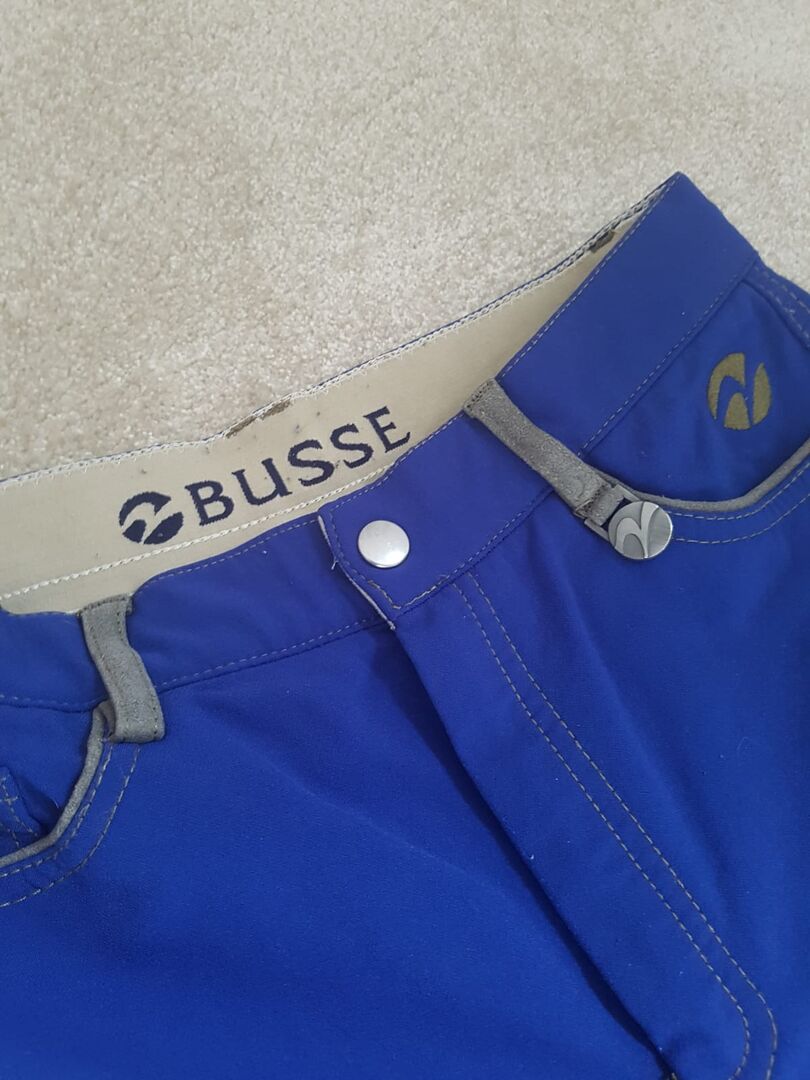 Blaue Mädchenreithose der Marke Busse mit hellgrau abgesetzten Nähten und Kunstleder-Vollbesatz. Die Beinabschlüsse sind elastisch. An den Hosentaschen befinden sich dezente Stickereien mit einigen Strasssteinchen. Sitzt bequem und bietet viel Bewegungsfreiheit. Leichte Gebrauchsspuren.