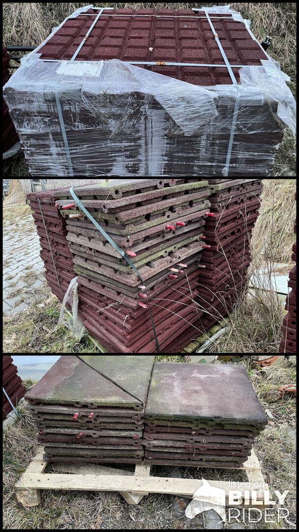 Gummimatte rotbraun 0,5x0,5m 4cm dick, mit Plastik Steckverbindern, Unterseite mit Raster, wasserdurchlässig, 2 Paletten mit je 96Stk=24qm (1 Palette komplett neu 34€je Quadratmeter, 1 Palette 3/4 neu pro qm 34€ und 4qm gebraucht pro qm 30€ und 4,5qm gebrauchte Matten mit kleinen Defekten, wie eine Ecke abgebrochen für 25€/qm) Gewicht 32kg/qm. Privatverkauf