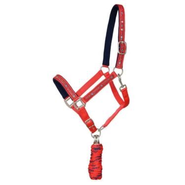 Halfterset "Starlet" 2- fach verstellbar über Dornschnallen Nase und Genick weich gepolstert goldfarbene oder silber satinierte Beschläge Sternen - Applikation inklusive Anbindestrick mit Panikhaken Größe :Full Farbe: Rot
