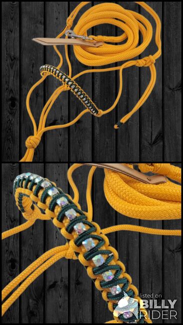 Handgefertigt von Freespirit Horse Art Set bestehend aus Strassknotenhalfter und Führstrick 3 m. Verzierung Nase Ocker und Graugrün. Die Strass Steinchen sind auf einem Band befestigt. Dieses Band wird mit Polypropylengarn umwickelt. Dadurch sitzen die Steinchen fest und können nicht abfallen. Knotenhalfter ist 6 mm dick, Leadrope 12 mm dick mit Lederklatsche