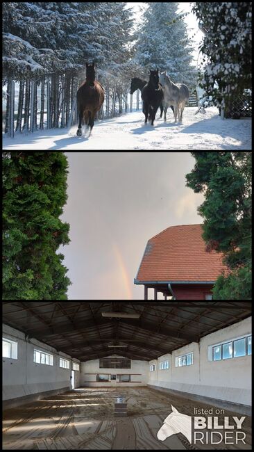Kleine Bewegungshalle ( 25x12), 2 Boxengassen a 8 Boxen, 2 Rasenplätze, direkte Anbindung an das Ausreit-Gelände, Heulager vorhanden.