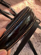 Super schöne Heinick Lacktrense in schwarz mit Strass und Schnallen in rosé! Gr. Warmblut mit weich gepolstertem schwedischem Reithalfter! Ideal für Show und Turnier! Anatomisches, weich gepolstertes Genickstück! Lag nur für eine Fotostrecke am Pferd und ist somit wirklich NEU!