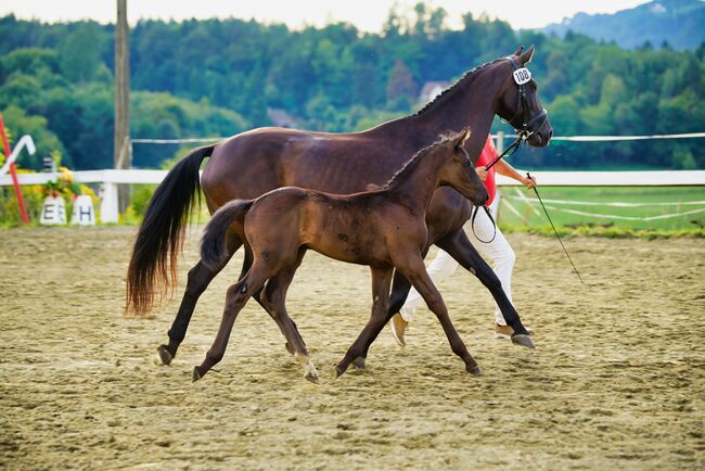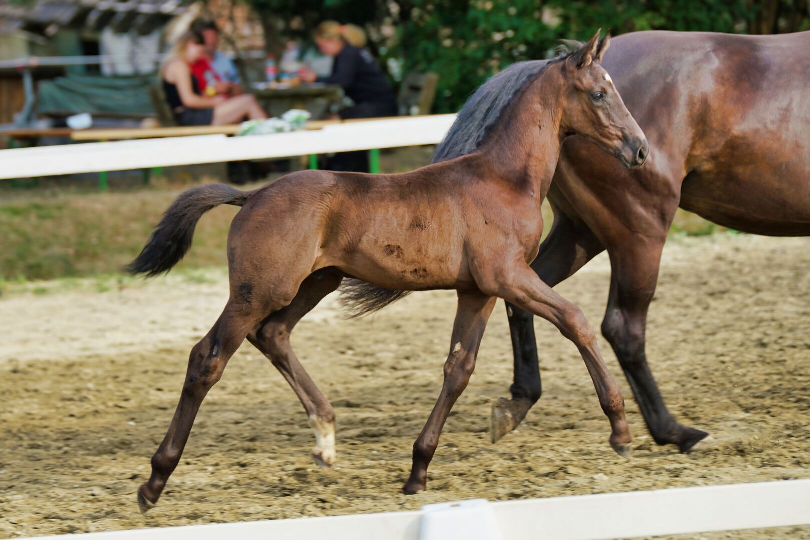 Das Hengstfohlen überzeugt bereits jetzt durch harmonischen Körperbau, viel Ausdruck und schwungvolle, elastische Bewegungen – beste Voraussetzungen für Sport und Zucht.