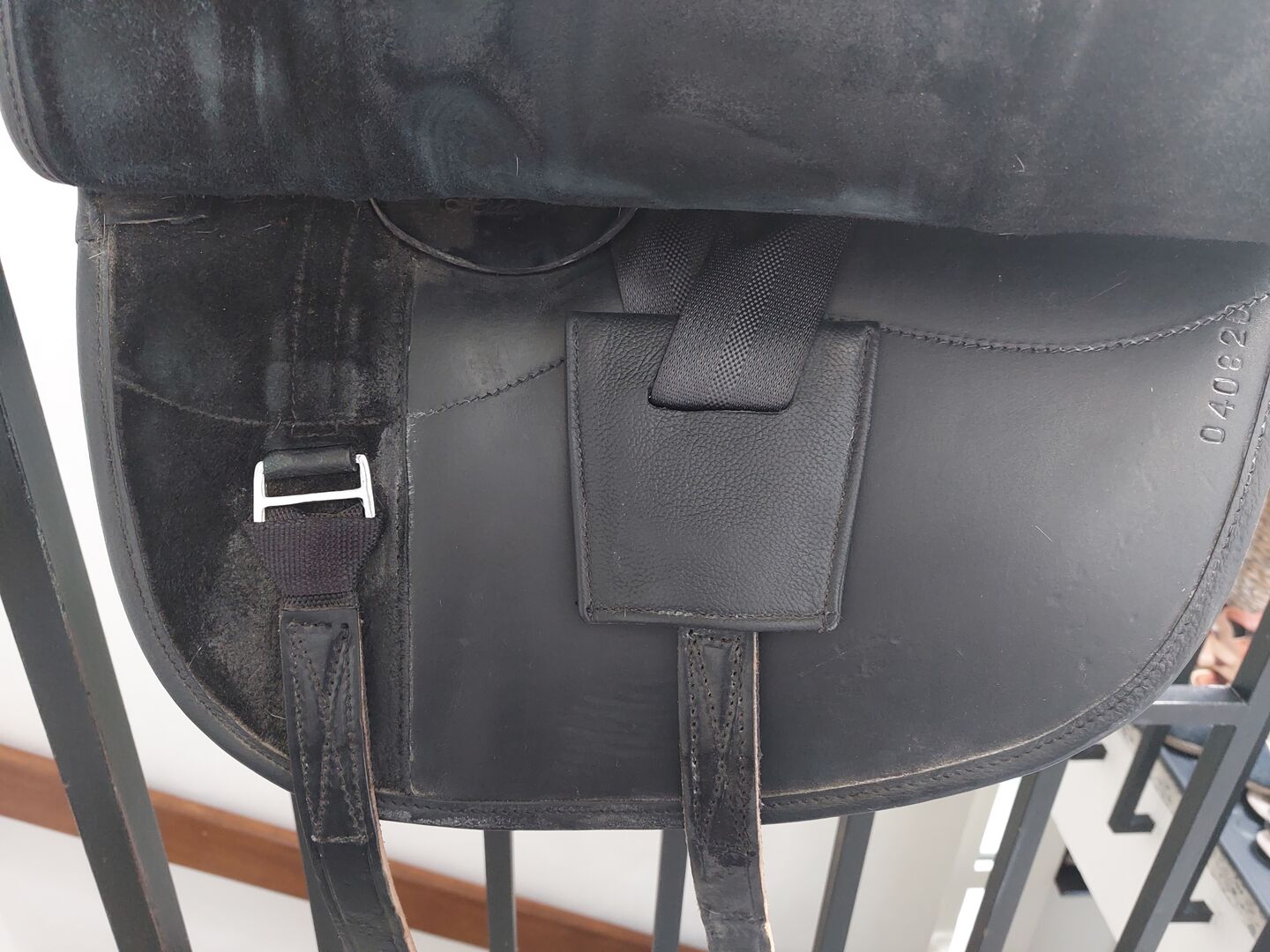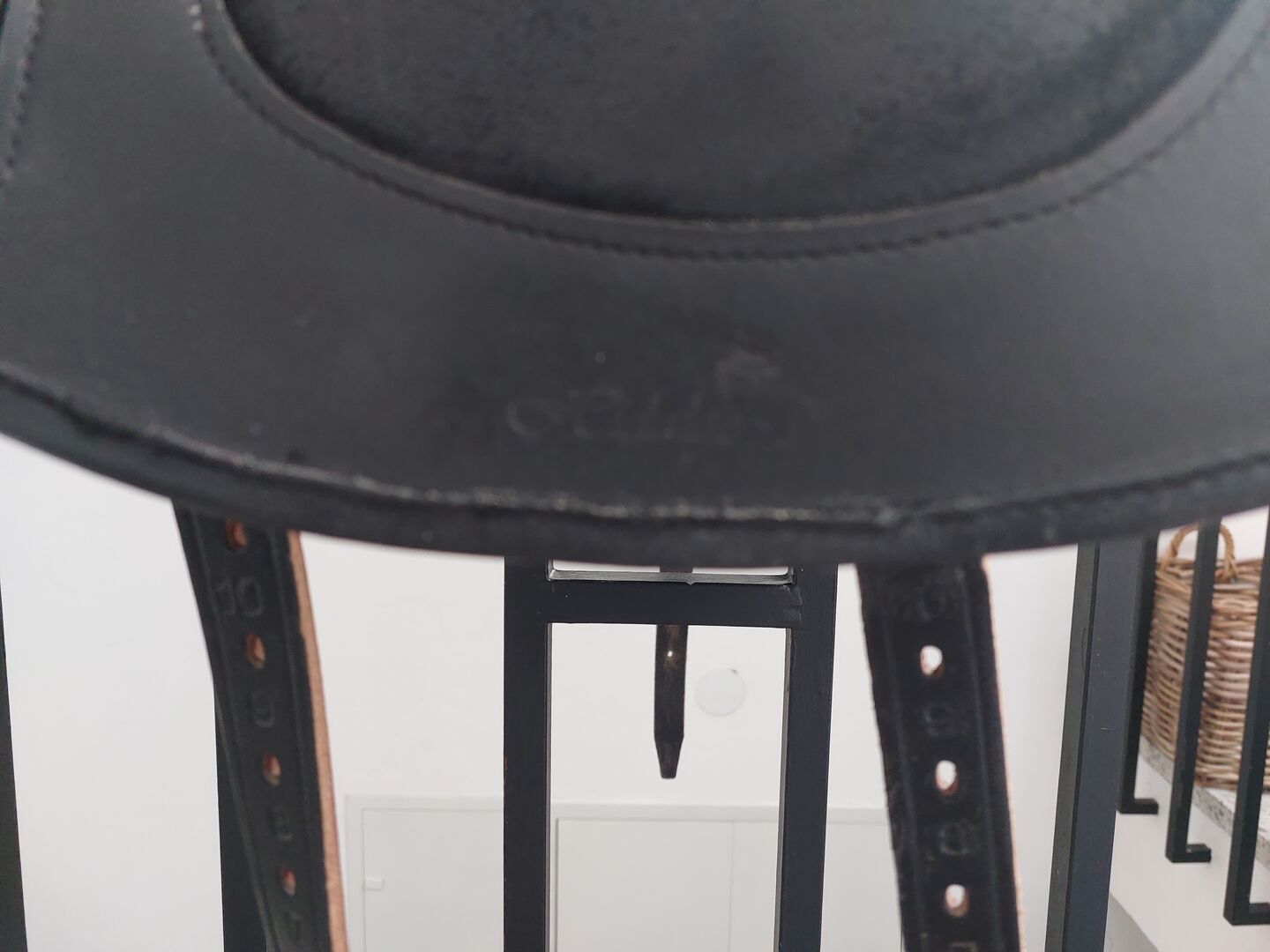 Die Sitzfläsche ist in schwarzen Wildleder gehalten. Leichte Gebrauchspuren durch Abnutzung vorhanden (Sattlnaht an der Beinlage)