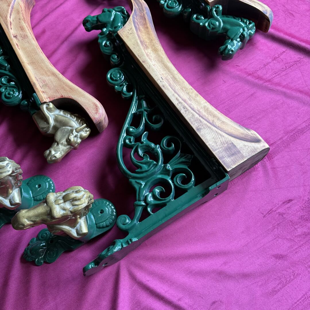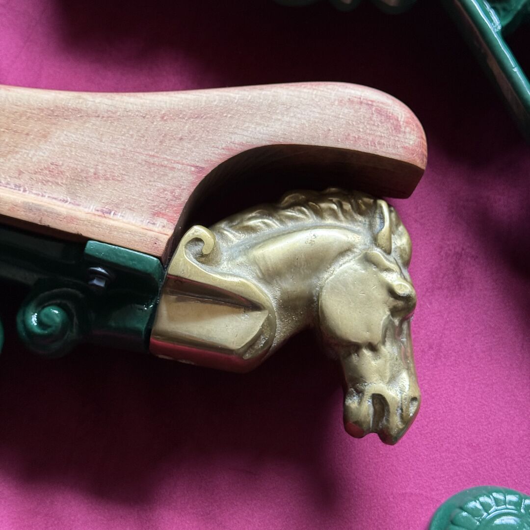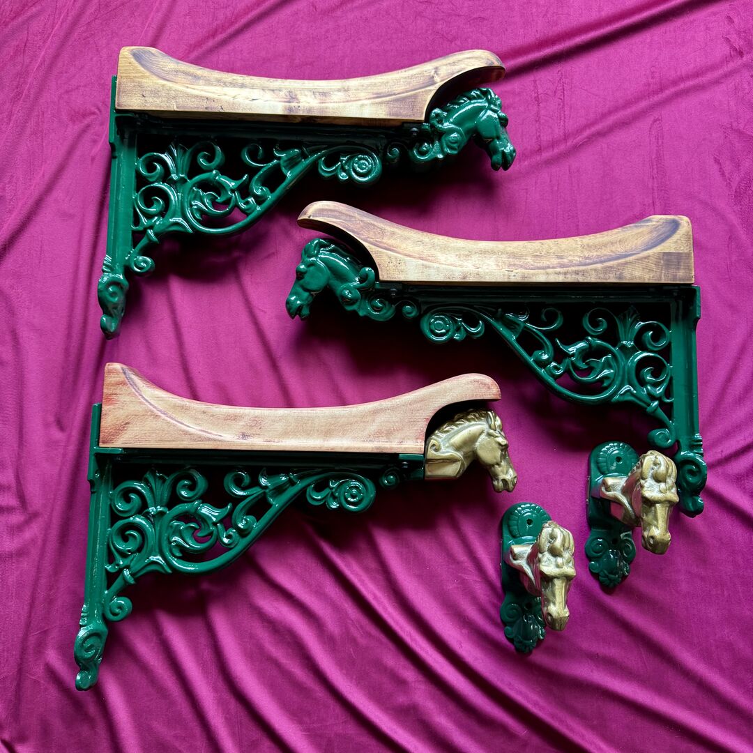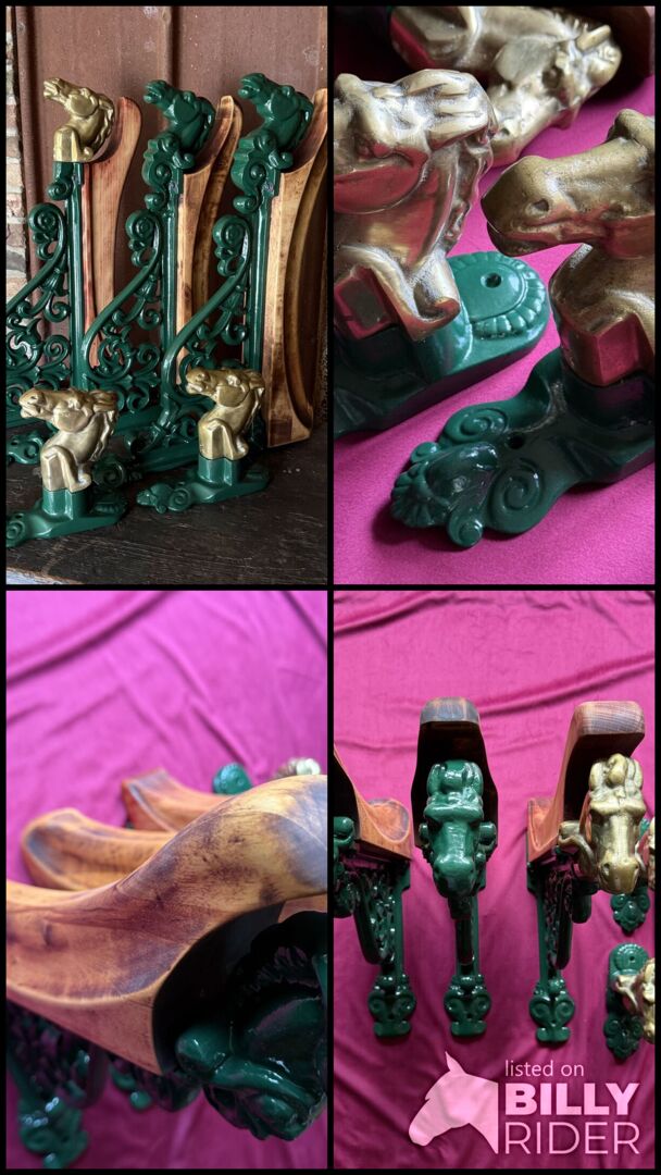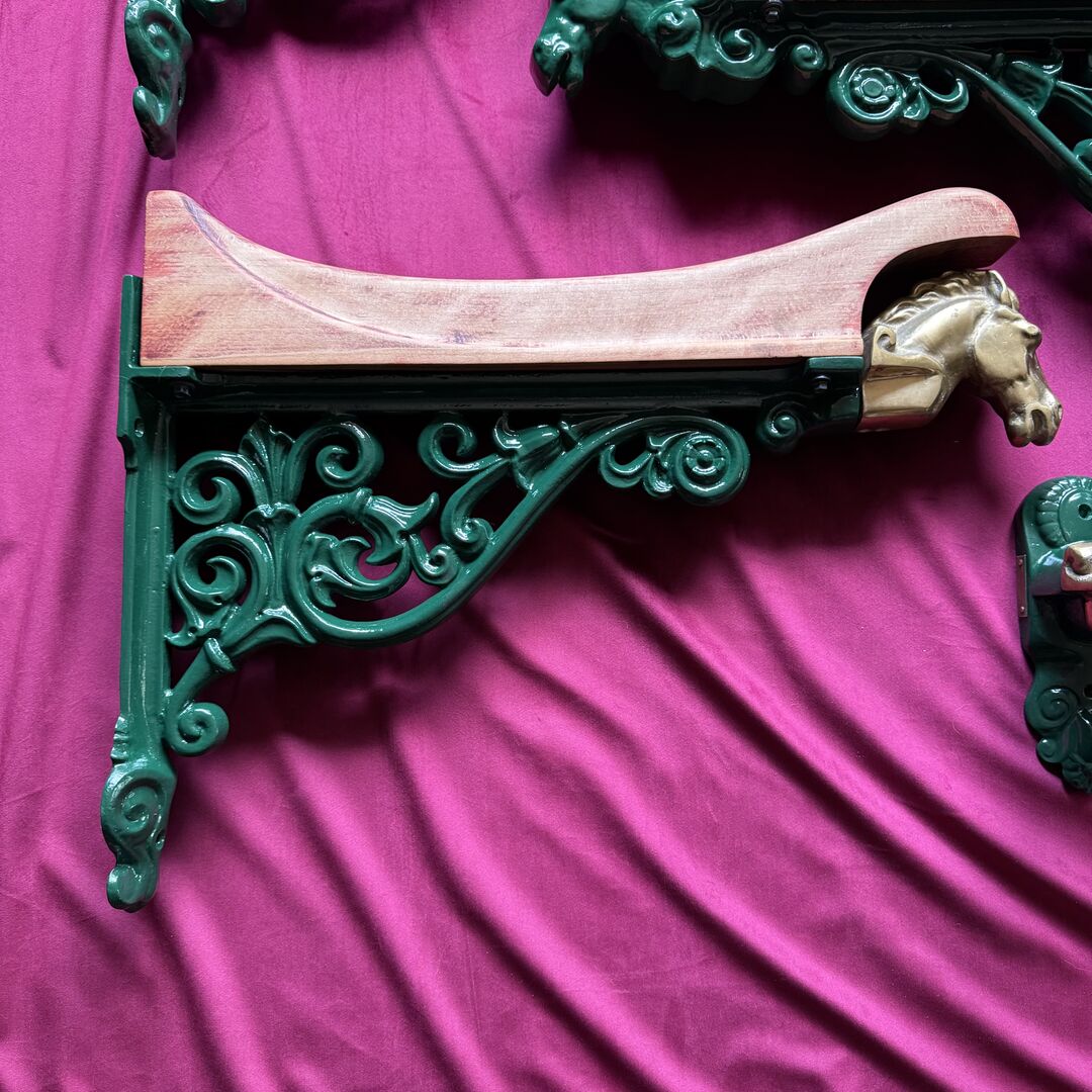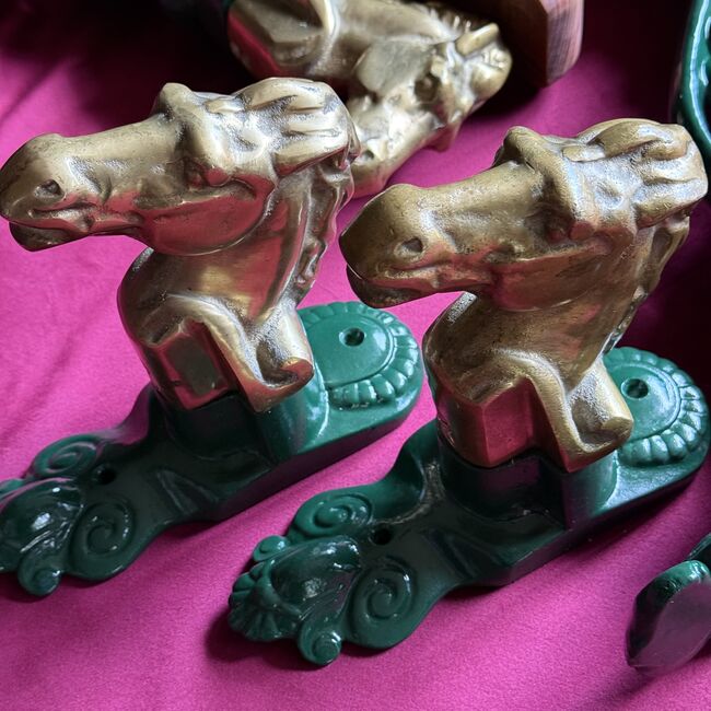 •Sattelhalter grün je Stück 190€ (NP pro Stück 420€) •Sattelhalter mit Pferdekopf aus Messing von Equipage 160€ •Trensenhalter mit Pferdekopf aus Messing von Equipage je Stück 120€