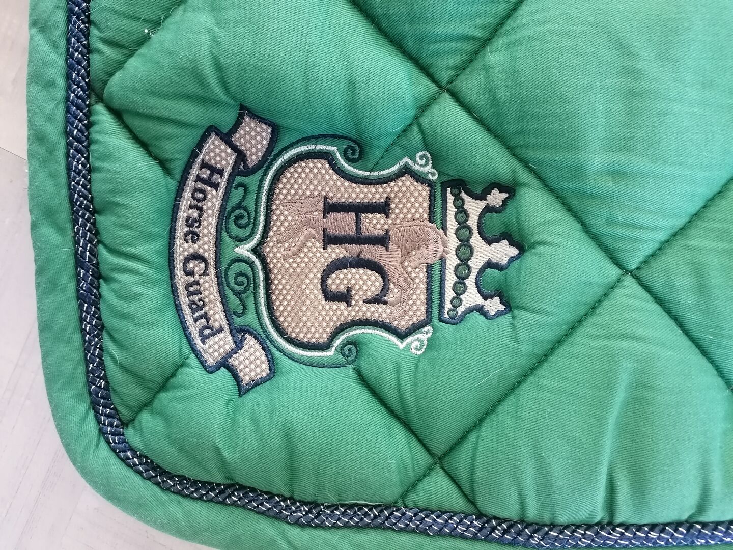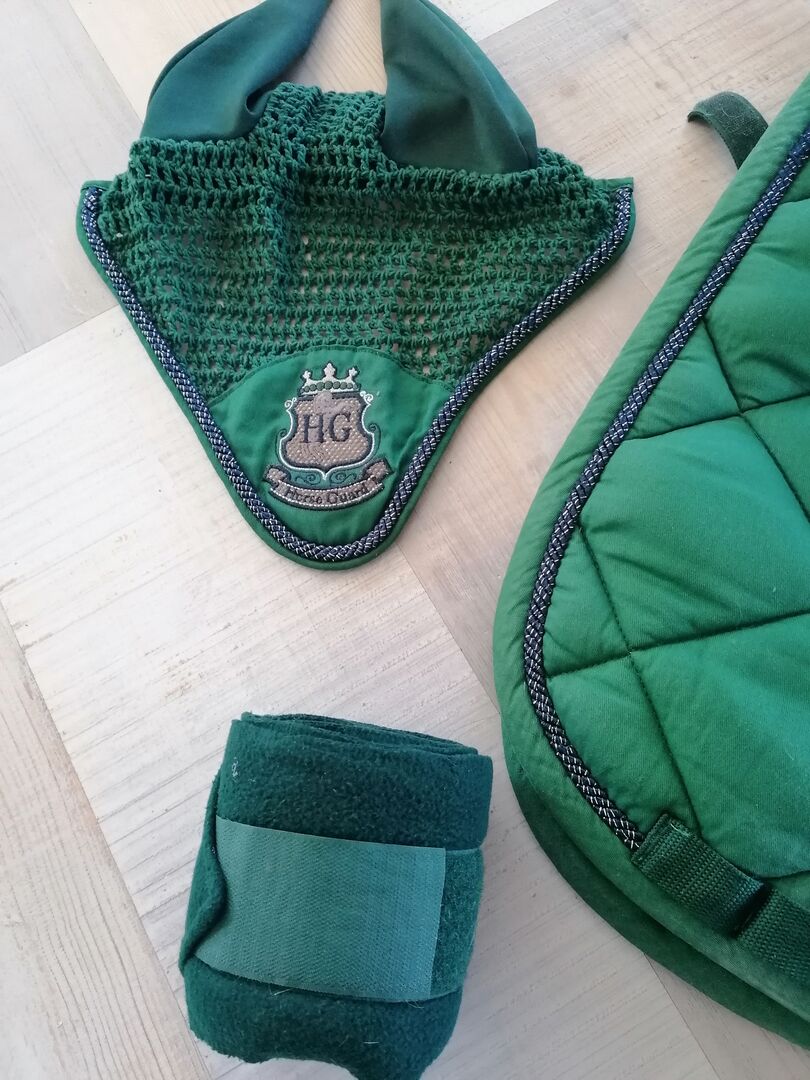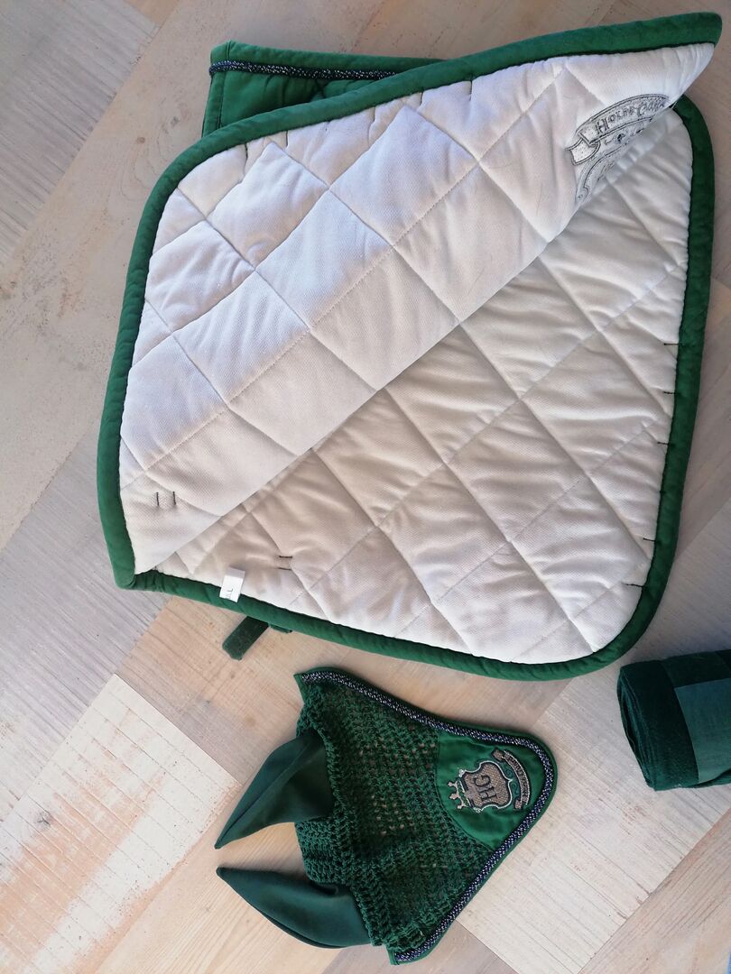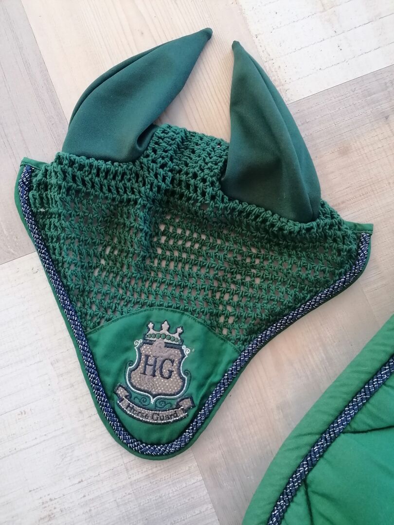 Verkaufe wunderschöne Set von der Marke Horse Guard in grün mit blauer Kordel mit Glitzerfaden Set beinhaltet: Schabracke full Dressur gebraucht aber top erhalten, frisch gewaschen Fliegenhaube neu 4 Bandagen neu
