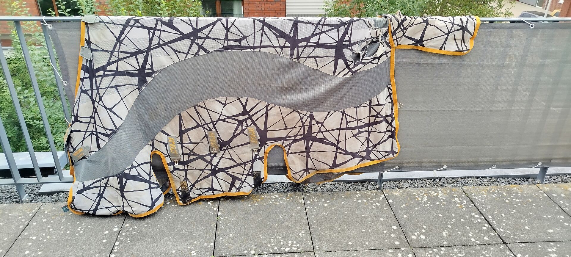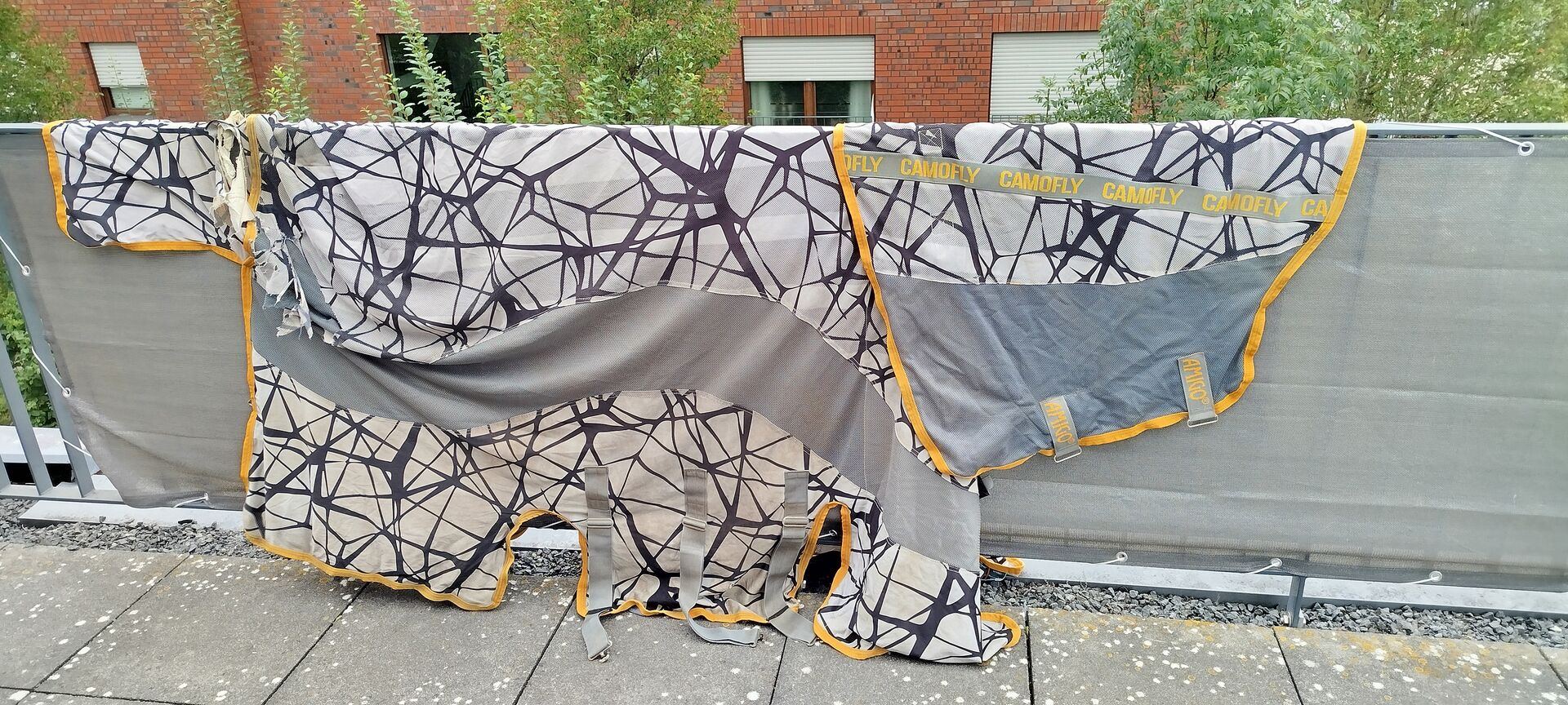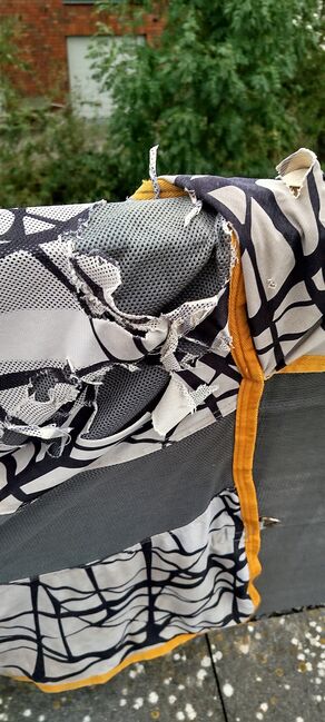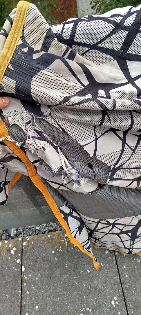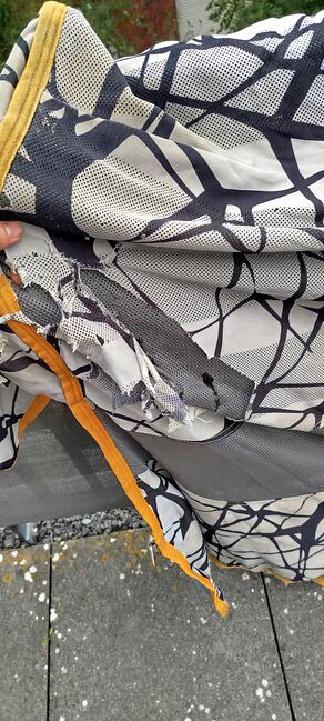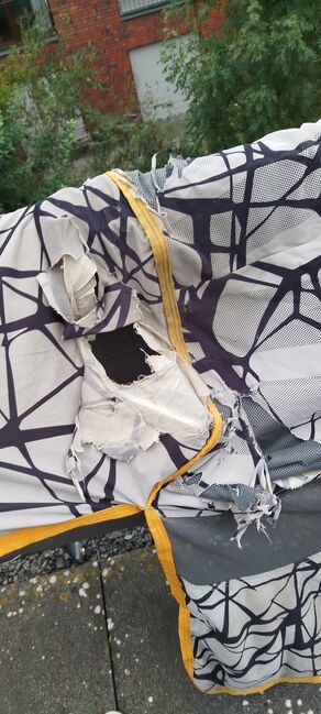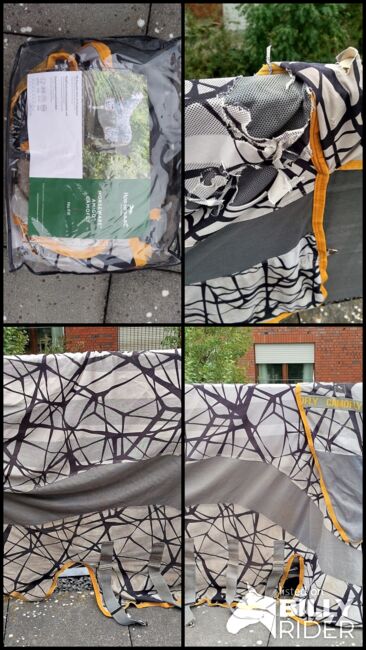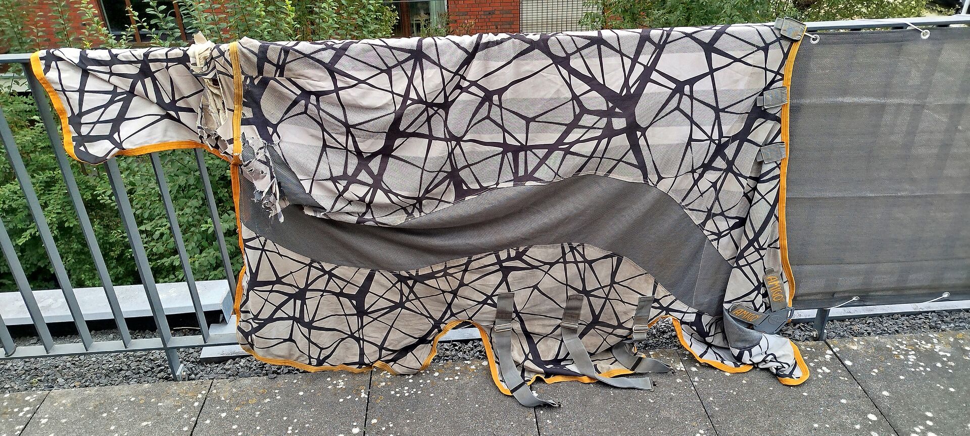 Verkaufe Reperaturbedürftige Fliegendecke von Horseware Modell CamoFly in 155cm Rückenlänge (ohne Halsteil). Die Decke weißt hinten am Schweiflatz und Kruppenbereich diverse Defekte, durch Scheuern, auf(siehe Bilder). Mit Geduld und etwas Talent im Nähen bestimmt zu reparieren. Detailfotos auf Anfrage
