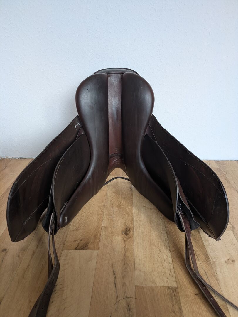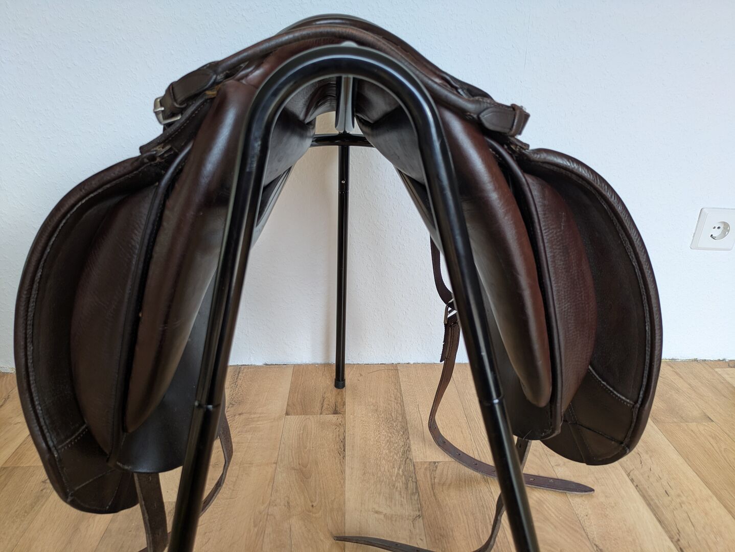Hrimnir Pro Soft Seat, 17", Gangpferdesattel, Islandpferdesattel, in der seltenen Farbe tobaco (dunkelbraun), wenig benutzt (1,5 Jahre ca. 3-4 mal/Woche, dann hatte das Pony erst einen Krankenschein und ging dann in die Frührente und ich selbst konnte aus gesundheitlichen Gründen auch nicht mehr reiten), sehr gepflegt mit ein paar üblichen Gebrauchsspuren, regelmäßig geputzt und mit Lederbalsam behandelt. Aktuell ist das graue (extra wide) Kopfeisen verbaut, 1 lila (medium) und 1 grünes (wide) Kopfeisen werden mitgeliefert. Ebenfalls dabei sind ein extra Paar Gurtstrupfen und ein Sattelschoner.