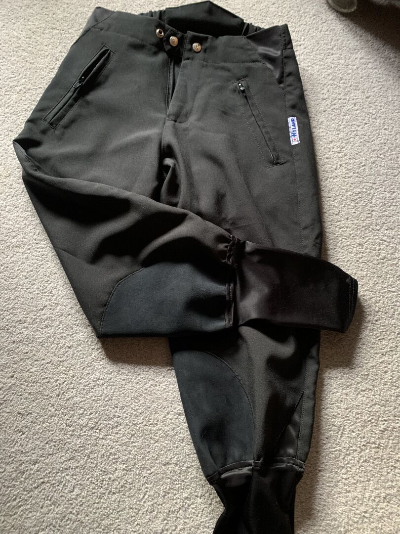 Nur ein paar Mal getragen, also wie neu. Schwarz. Wildleder an den Waden und unten, Lycra an den Knöcheln. Doppelter Druckknopf am Hosenschlitz. Größe 28" Taille. Unisex.