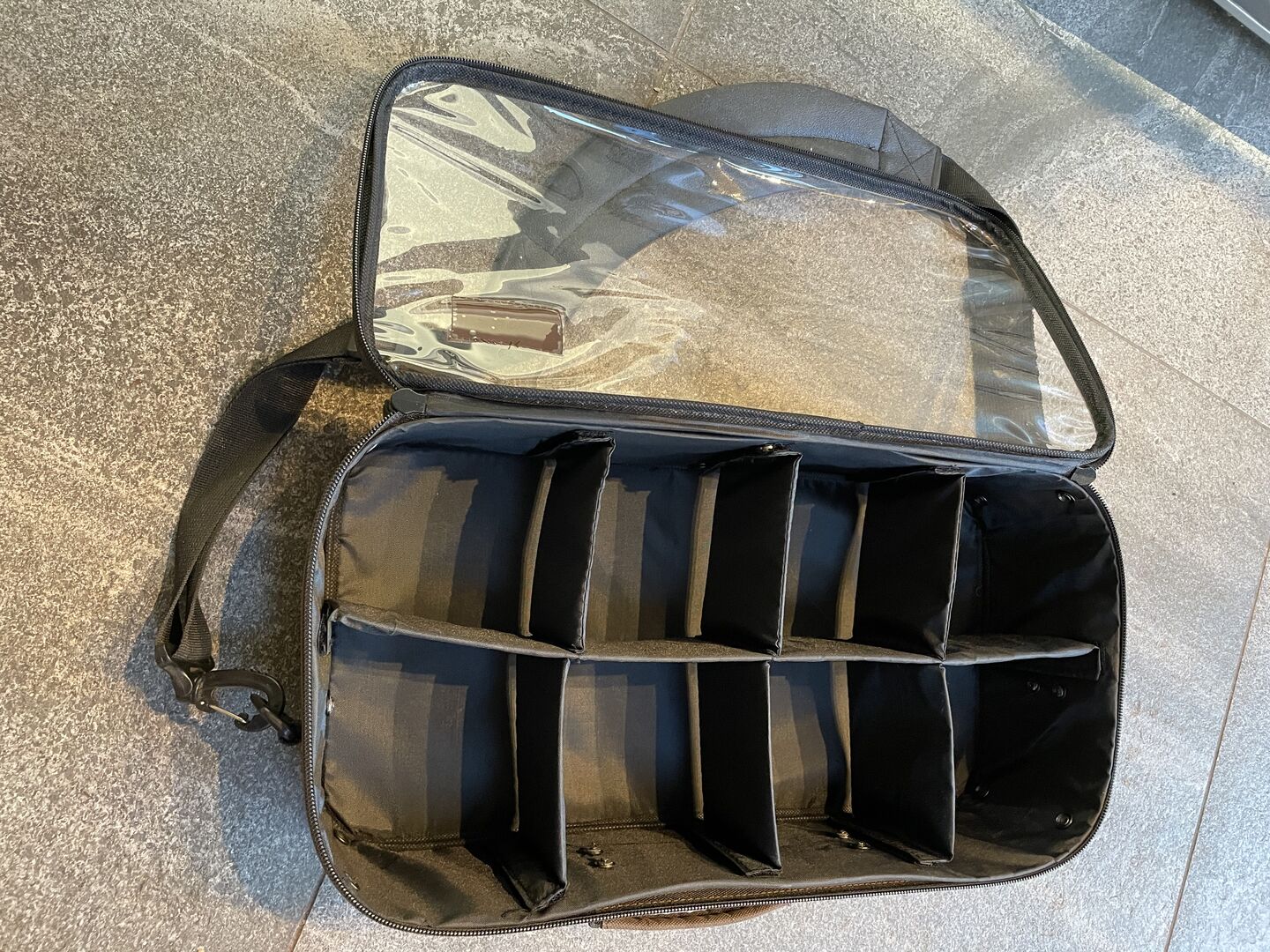 Elegante Tragetasche mit Schulterriemen. Fasst 8 einzelne Vliesbandagen. Braune Farbe mit transparentem Deckel, der mit einem Reißverschluss geschlossen werden kann. Sehr praktisch und leicht zu verstauen