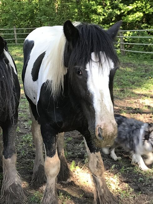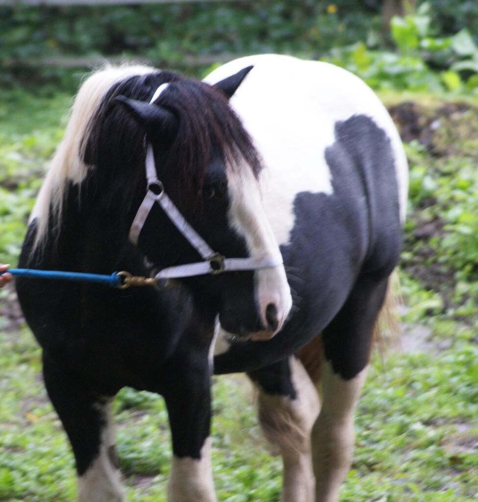 Larry ist 7 Jahre alt. 152 cm gross. Immer noch Hengst. Er hat noch nie gedeckt. Er trägt meine Lieblingsfarbe Schwarz Tobiano. Larry kennt das Fohlen - ABC, ist sonst aber noch roh. Er ist in einer Hengstgruppe in Robusthaltung aufgewachsen. Er ist eher der mutige Tinker, schaut sich die Sachen gerne an, geht aber dann ohne Probleme weiter. Er ist dem Menschen zugewandt und bleibt auch mal ohne Halfter beim Menschen stehen. Larry hat einen Pass vom ICS Nederland. Beide Eltern sind beim ICS Nederland registriert und prämiert.