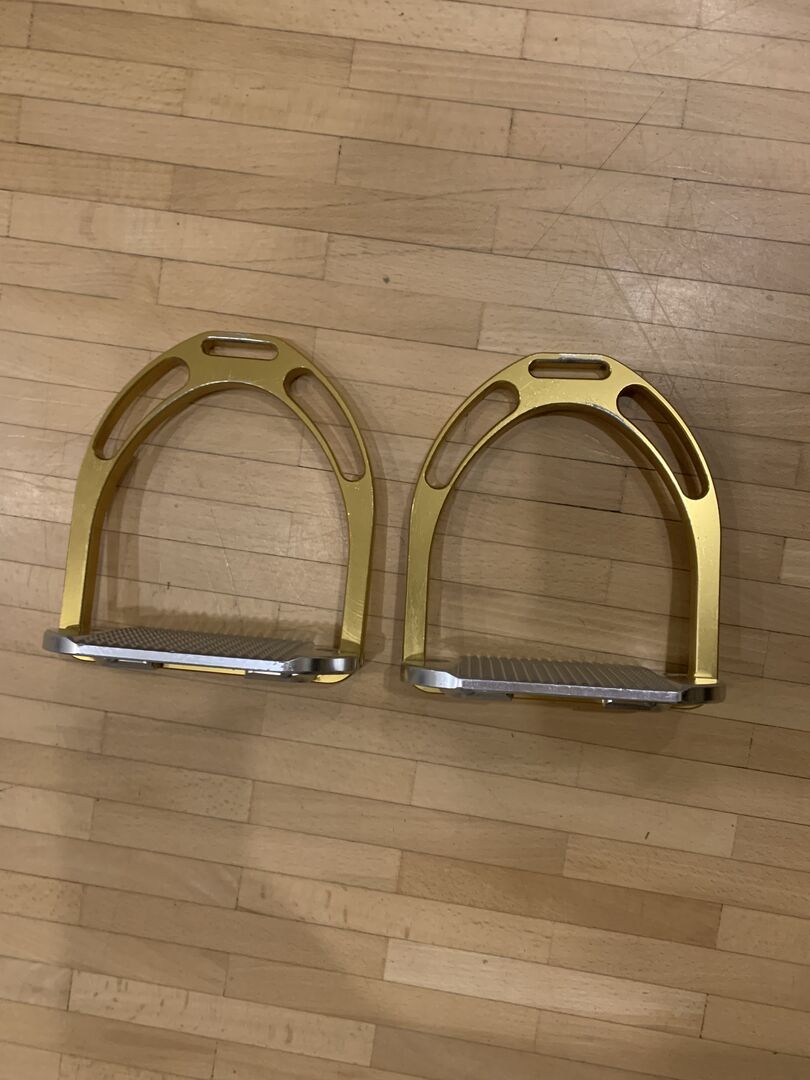 Ich biete wenig gebrauchte Jin Stirrup Steigbügel in Gold mit silberner Auflage. Die Steigbügel sind original und haben keine Gebrauchsspuren auf der Auflage. Allerdings sind, wie auf den Fotos zu sehen leichte Gebrauchsspuren wie Kratzer von den Steigbügelriemen zu sehen.