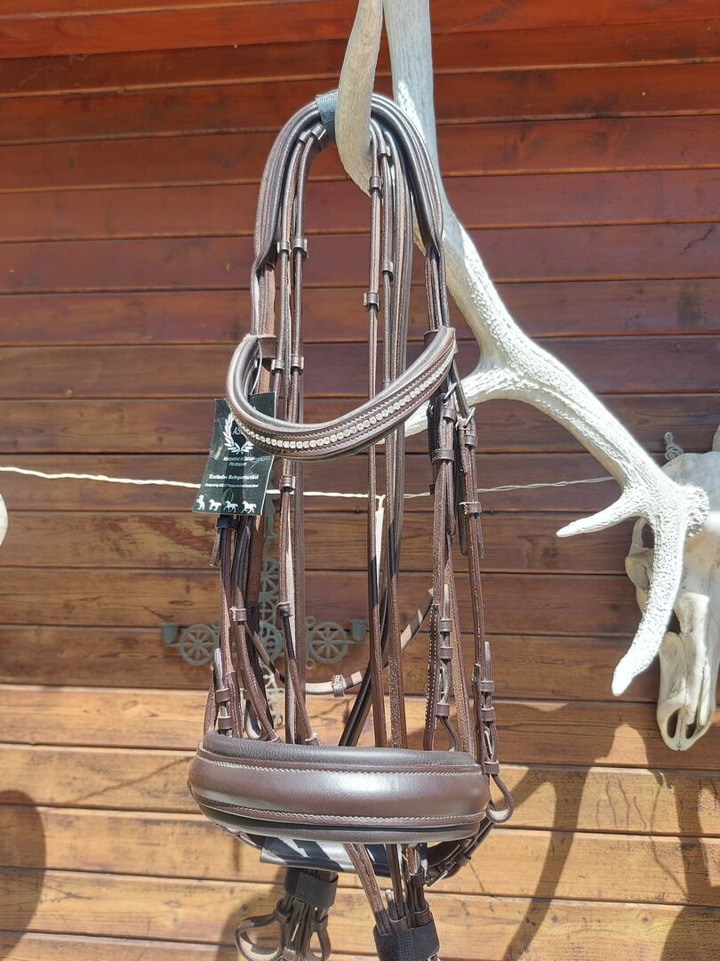 Unbenutzer, brauner Kandarenzaum mit Glitzerstirnband, weich und breit gepolsterter Nasenriemen, schwedische Verschnallung, inkl. Lederkandarenzügel mit Stegen