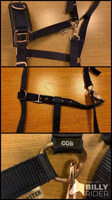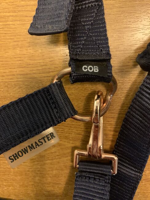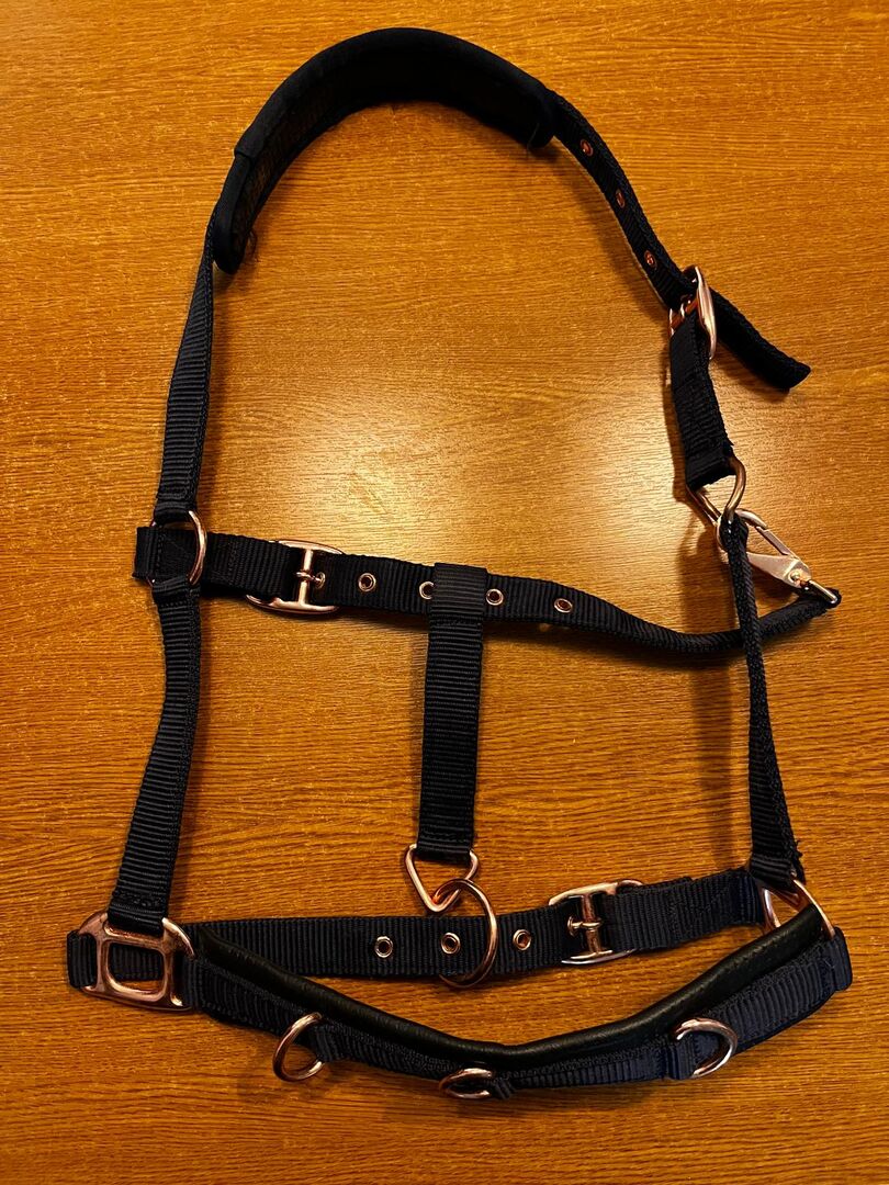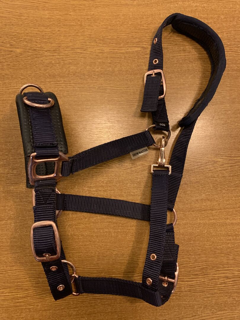 Shwowmaster Kappzaum in dunkelblau mit breitem Nasenriemen. Ösen in Rosé, ein Ring leicht verbogen, keine Einschränkung der Funktionalität