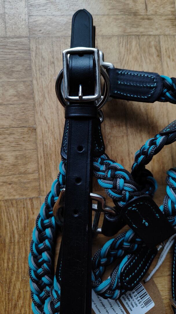 Die Kombination aus geflochtenem Segeltau in verschiedenen Farben sowie den ledernen Elementen verleiht dem Halfter einen verspielten, aber dennoch eleganten und schicken Look. Für eine perfekte Passform kann das geflochtene Halfter beidseitig am Genick sowie am Nasenriemen verstellt werden.