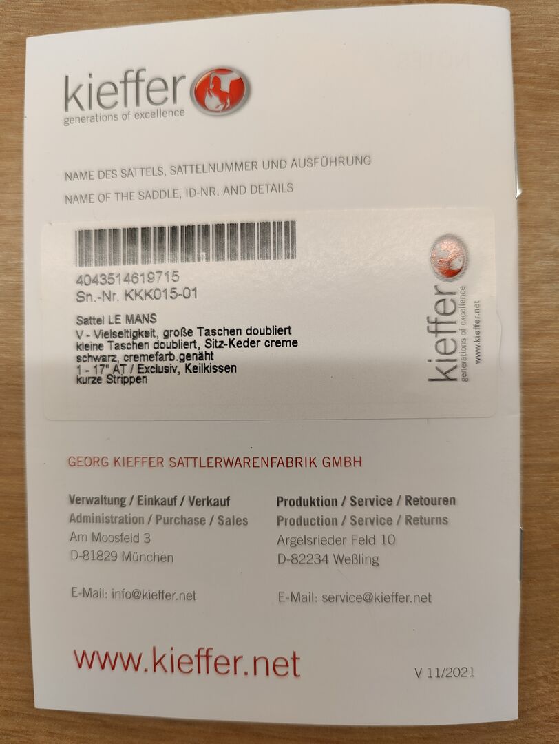 Verkaufe ein Jahr alten Kieffer Le Mans Vielseitigkeitssattel in schwarz mit weißen Kontrastnähten. Er lag auf einem breiten Huzulen ohne Widerrist und ist auch für breite Pferde mit eher geradem Rücken gebaut. Sitzgröße beträgt 17,5 Zoll. Neupreis lag bei 2700€, Sattelpass ist vorhanden. Bei Bedarf kann ich auch gern einen Memory Foam Sattelgurt mit 125cm mit dazugeben.
