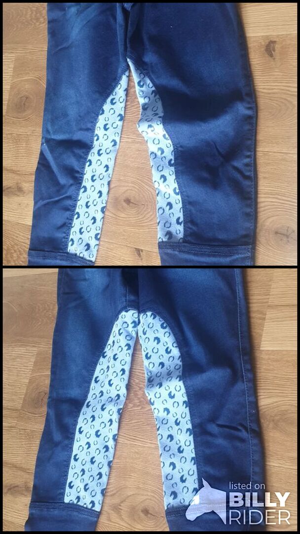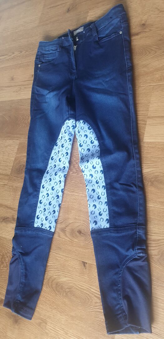 Kinder Reithose in dunkelblau und an den Innenschenkeln mit hellblauen Applikationen und Hufeisen/Pferdkopf Druck, Größe 152, Versandkosten 5,00€