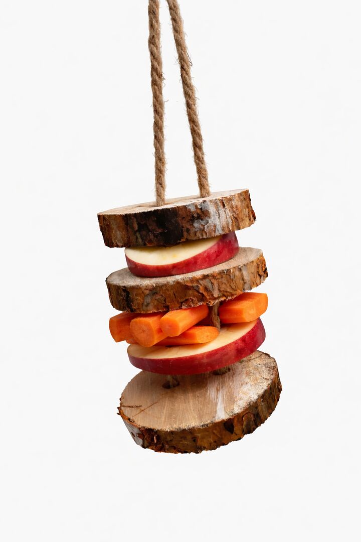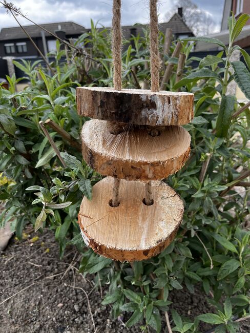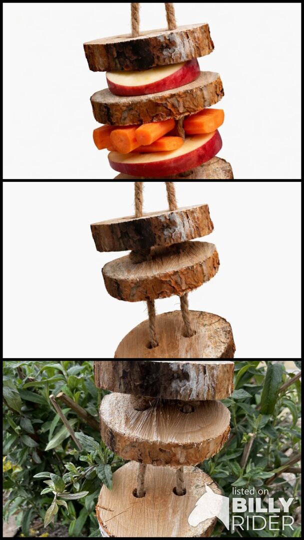 Die drei Holzscheiben sind an einem stabilen Seil befestigt und können mit Apfelstücken, Möhren oder anderen geeigneten Leckereien bestückt werden. So entsteht eine schöne Beschäftigung für dein Pferd im Stall oder auf dem Paddock.