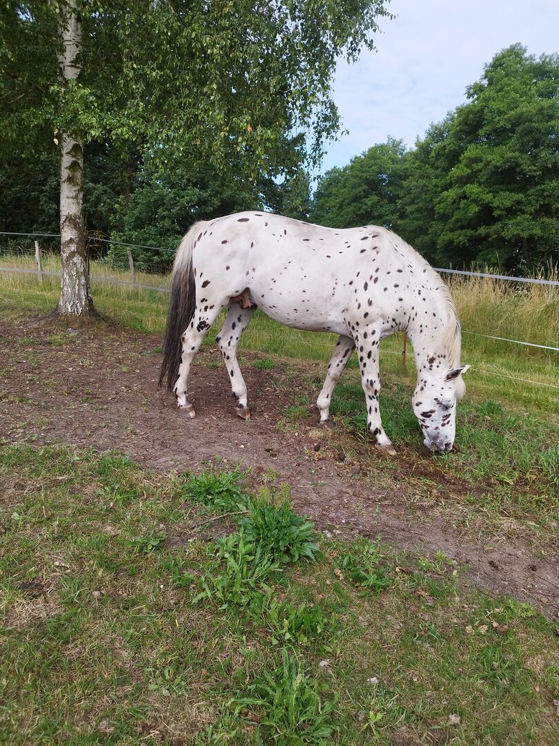 Wir verkaufen, wenn alles passt, unseren 8 jährigen Knabstrupper Hengst. Er kennt Bodenarbeit und Reitergewicht. Er ist ein sehr ruhiger, ausgeglichener Hengst, der mit anderen Hengsten und Wallachen zusammen stehen kann. Er kennt Offenstall sowie Boxenhaltung und ist E-Zaun sicher, sowie schmiede- und verladefromm. Aktuell steht er mit einem weiteren Hengst auf der Koppel. Er hat nur einen Equidenpass ohne Abstammung.