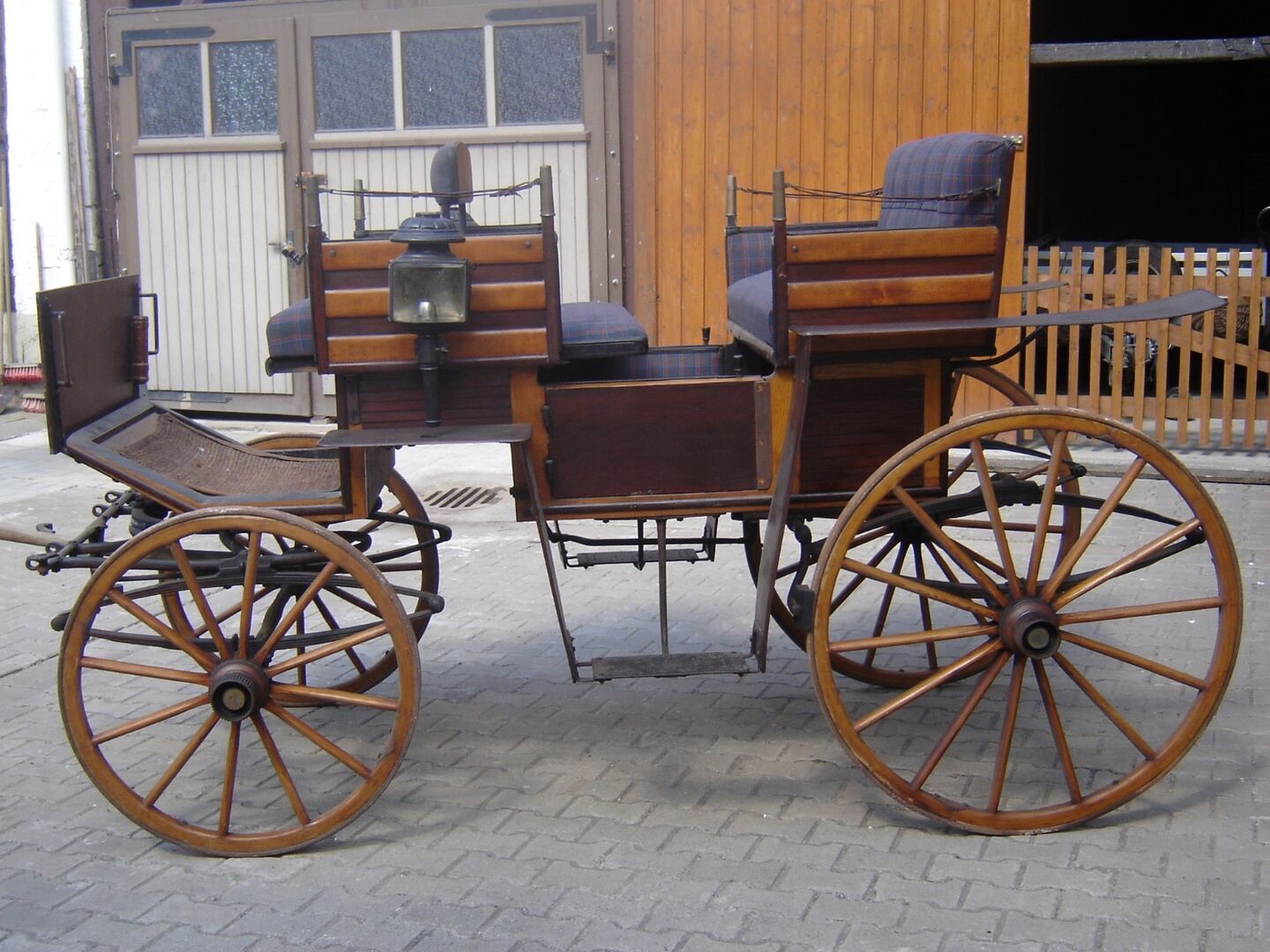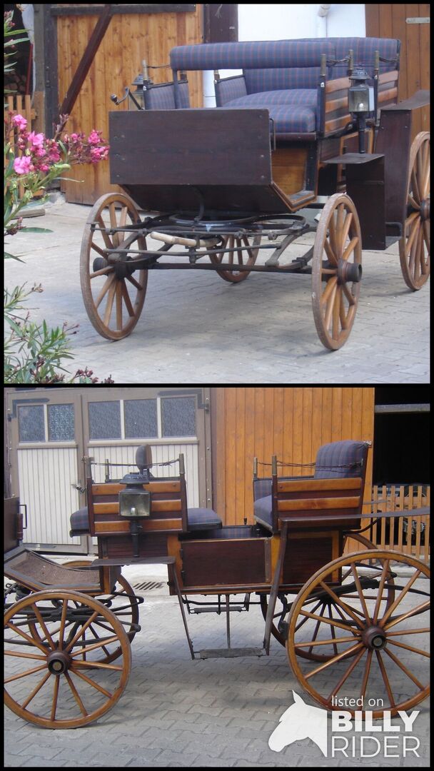 Hier zwei Bilder von der Kutsche . Dazu gehören noch Deichsel und Schere zum Anspannen der Pferde ( 1 oder 2 Pferde ) . Baujahr zwischen 1925 und 1930 , Sitze sind neu bezogen, für das Alter super Zustand . Preis 450 Verhandlungsbasis .
