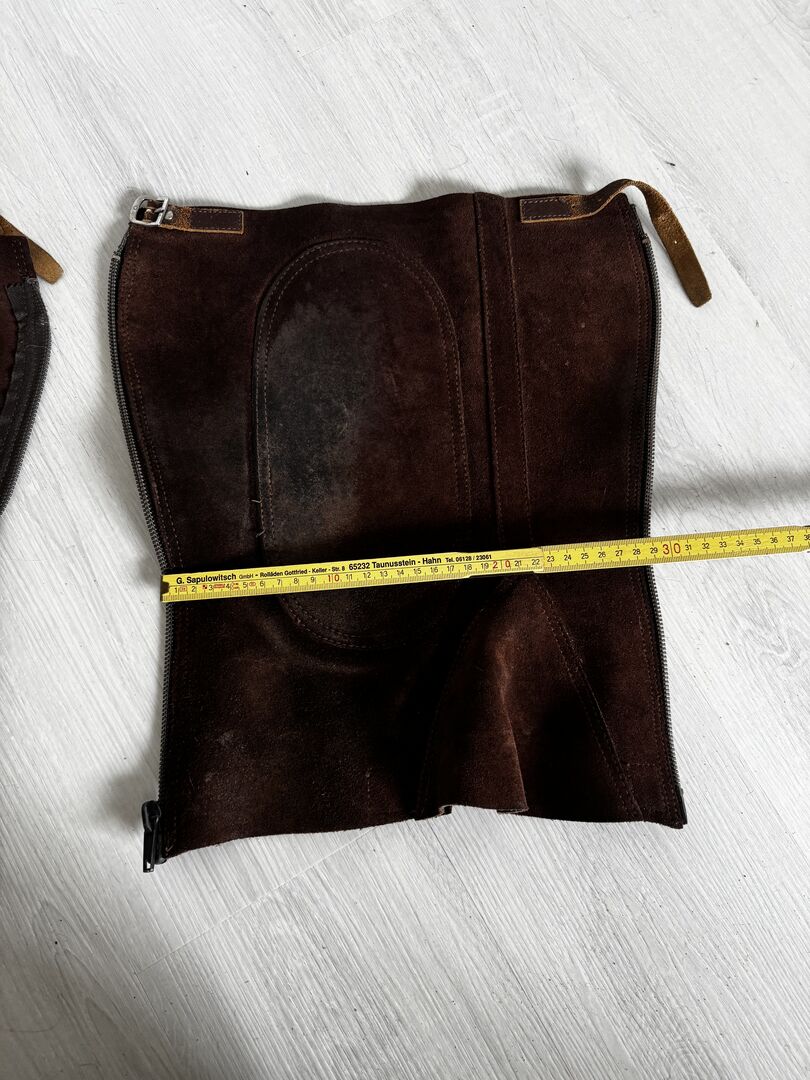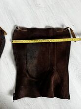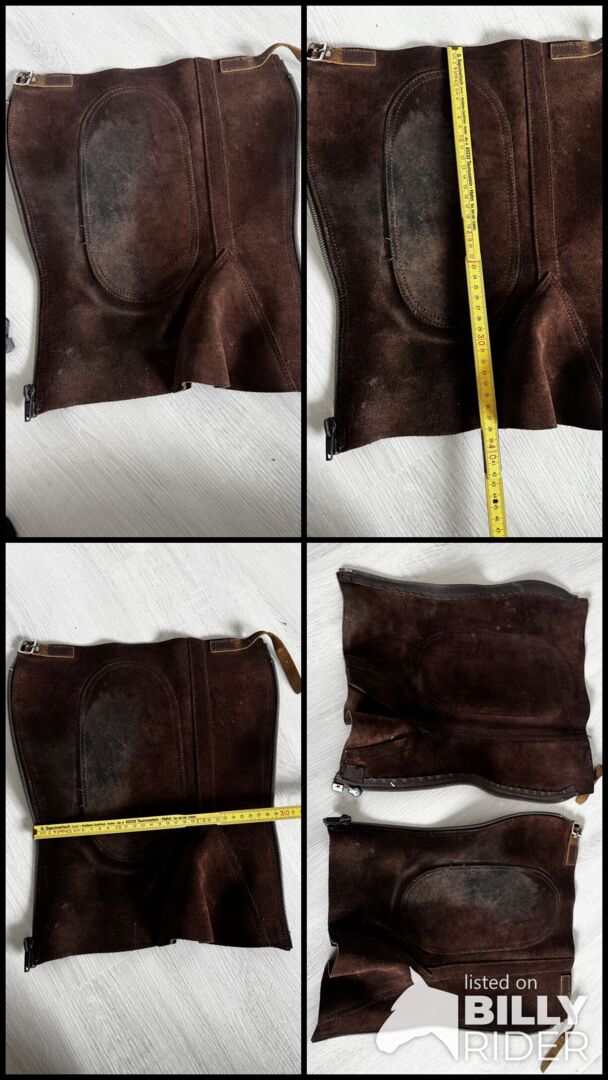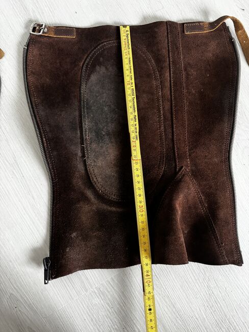 Lederchaps in Braun. Gut erhalten. Maße können den Bildern entnommen werden. Lediglich die Fussschlaufen wurden abgeschnitten. Privatverkauf daher keine Garantie oder Rücknahme. Versand gegen Kostenübernahme möglich.
