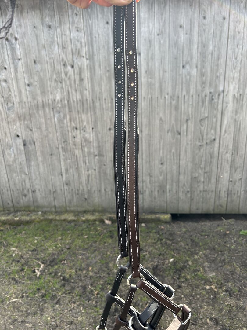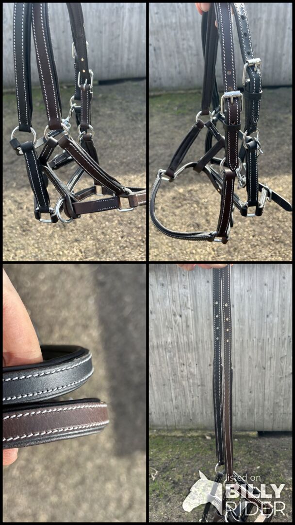 Lederhalfter, die leider zu klein waren. Das Leder ist sehr glatt und weich mit leichtem Polster am Genick- und Nasenriemen. Die Kinnriemen haben eine gebogene Schnalle. Das Metall ist rostfrei.