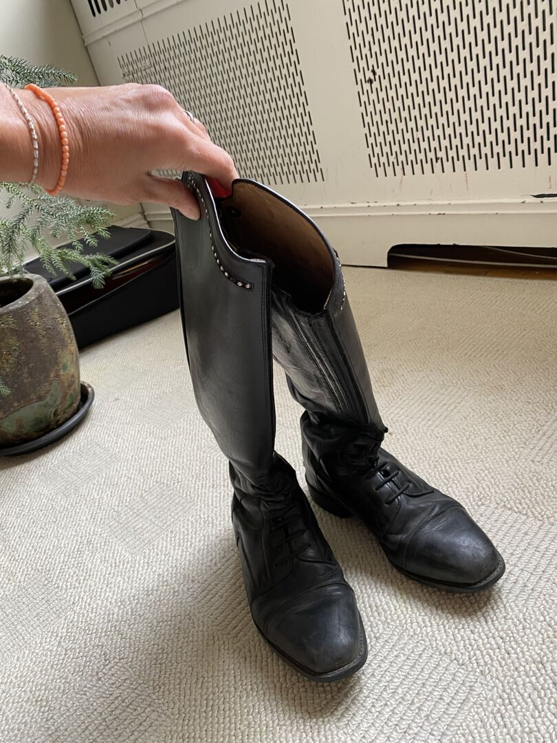 Gebrauchte, aber gut erhaltene Lederreitstiefel in Größe 36 für Mädchen, vorn mit dekorativer Schnürung und Strasssteinchen am Schaftabschluss. Reißverschluss hinten, Stretcheinsatz am Schaft für komfortablen Sitz.