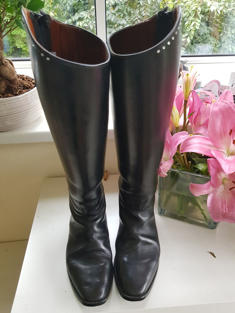 Verkaufe schwarze Lederreitstiefel von Petrie. Die Stiefel haben einen tollen Dressurbogen, welcher mit Strass besetzt ist(1-2 Steine fehlen, könnten aber ohne Probleme ersetzt werden). Größe: 8 1/2 Wade: 39 Höhe: 50