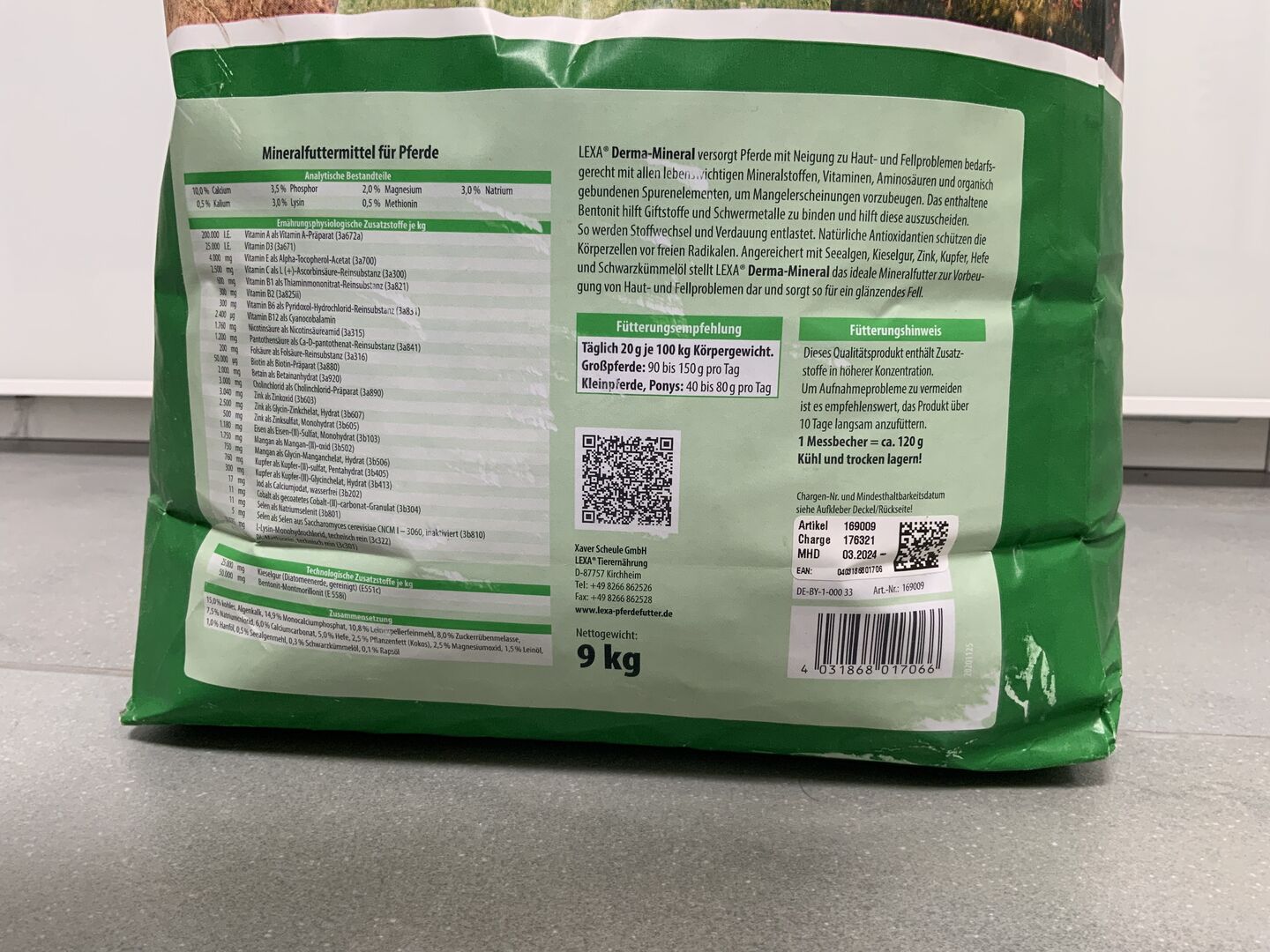Wegen Futterumstellung verkaufe ich einen neuen, noch verschlossenen Sack (9 kg) Mineralfutter Lexa Derma-Mineral. MHD 03/2024