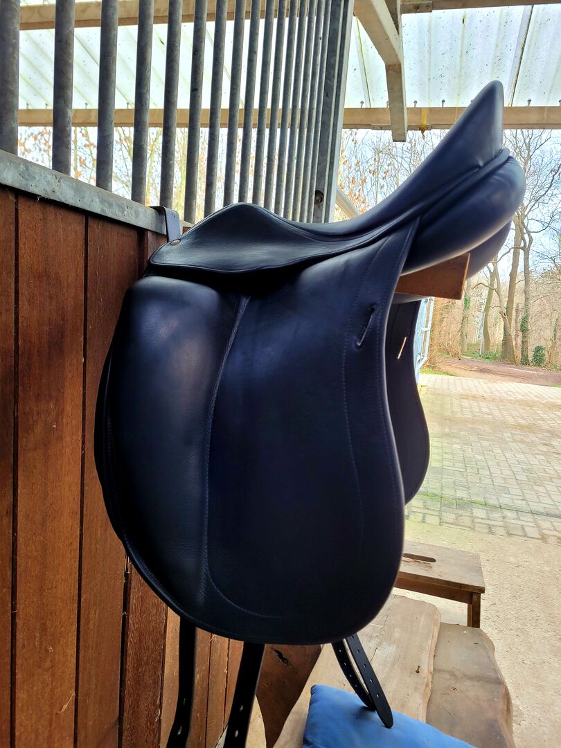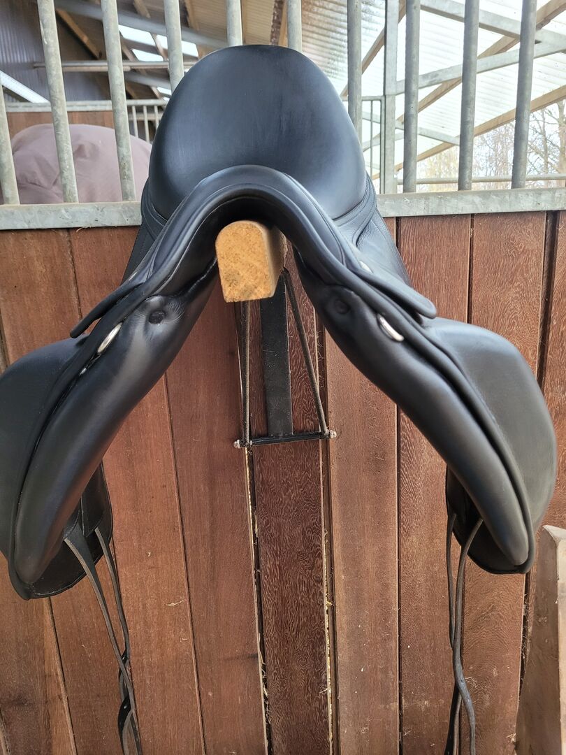 Dressursattel, Model DAC mit der Sitzgröße 16,5, normalem Sattelblatt, sehr breitem Wirbelkanal und normaler/ bis weiter Kammer.