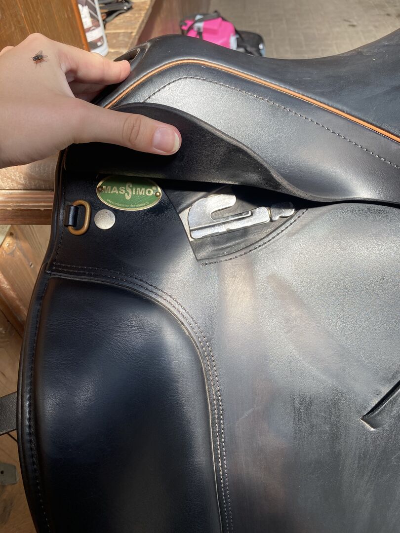 Massimo Dressursattel mit der Sitzgröße 17,5, aus der ich leider herausgewachsen bin.