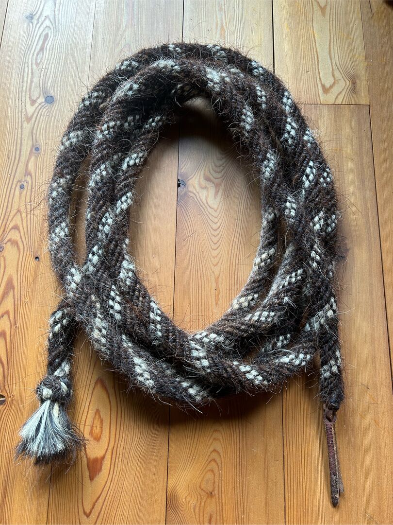 Schöne, geflochtene Mecate aus Pferdehaar. Schon ältere Handarbeit, aber wenig gebraucht. 3/4 Zoll und 7,35 Meter lang. An manchen Stellen haften noch weiße Haare meines Camargue Pferdes.