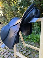 Der Sattel hat einen extra tiefen Sitz, weit vorgebaute Sattelblätter, weich abgepolsterte Kniepauschen und de abnehmbare starke Wadenpauschen verhelfen auch dem weniger routinierten Springreiter zu einem festen und ausbalancierten Sitz.