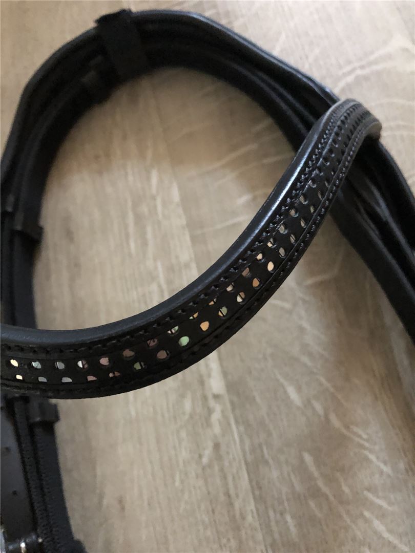 nagelneues Zaumzeug in schwarz Gr: WB 1x zur Anprobe am PFERD - unverbraucht keine Schäden, etc. Stirnriemen: Silberkette unter Leder - elegant, nicht zu aufgetragen - sehr dezent Nasenriemen: schmal, jedoch sehr gut & weich gepolstert Genickstück: breit, sehr weich und etwas nach hinten geschnitten für genügend Ohrenfreiheit Eignung: perfekt für schmale, zierliche Köpfe; jedoch auch super für etwas massigere (Zaum kommt hier nur nicht zur Geltung - Nasenriemen könnte etwas schmal dafür sein; für solche Köpfe nur geeignet, da der Nasenriemen besonders gut verstellbar ist)