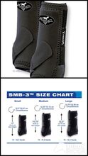 Die Außenseite besteht aus auf „limestone“ basierendem Neopren. Dieses Material schützt in Verbindung mit der „Ultra-Shock“ Fütterung das Griffelbein, die Sehnen und das Gewebe, zudem wird zusätzlich die Erschütterung des Auffußens etwas absorbiert. Der etwas längere Unterzug umschließt den Fesselkopf und gewährleistet trotzdem völlige Bewegungsfreiheit des Fesselgelenks und bietet einen gewissen Schutz vor Überdehnungen. Die SMB 3 sind im vorderen Bereich der Fessel höher ausgeschnitten, um eine bessere Passform in Kombination mit jeglicher Art Glocken zu gewährleisten. Die leicht dehnbare Einfassung sorgt für besseres Anliegen am oberen sowie unteren Rand und verhindert somit das Eindringen von Schmutz und Sand.