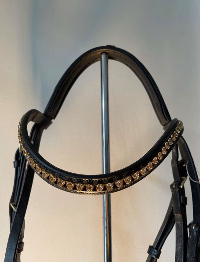 Marke: 4HORSES Größe: Full Neupreis: 89,90€ Art: Englisch kombiniert mit Sperrriemen Farbe: schwarz mit goldenen Schnallen Stirnriemen: mit goldenen Glitzer-Verzierungen Genickstück und Nasenriemen weich gepolstert Zügel: Gurtzügel mit Martingalstoppern