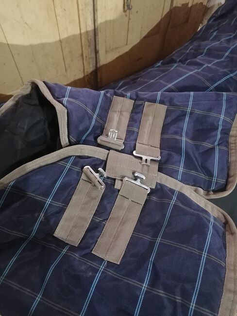 Sie lag nur dreimal auf dem Pferd zur Anprobe (deshalb sind ein paar Haare daran zu finden), ansonsten ist sie nie benutzt worden und deshalb wie neu. Sie ist dunkelblau mit beigefarbenem Karomuster, hat Beinschnüre und Schweifkordel. Die Decke ist vorne mit zwei Schnallen zu verschließen und hat am Bauch eine Kreuzgurtung sowie vorne eine Gehfalte und innen Stoffbezug (kein Fleece).