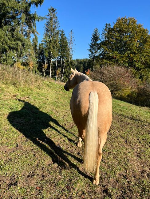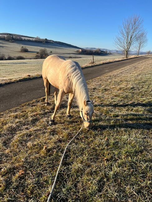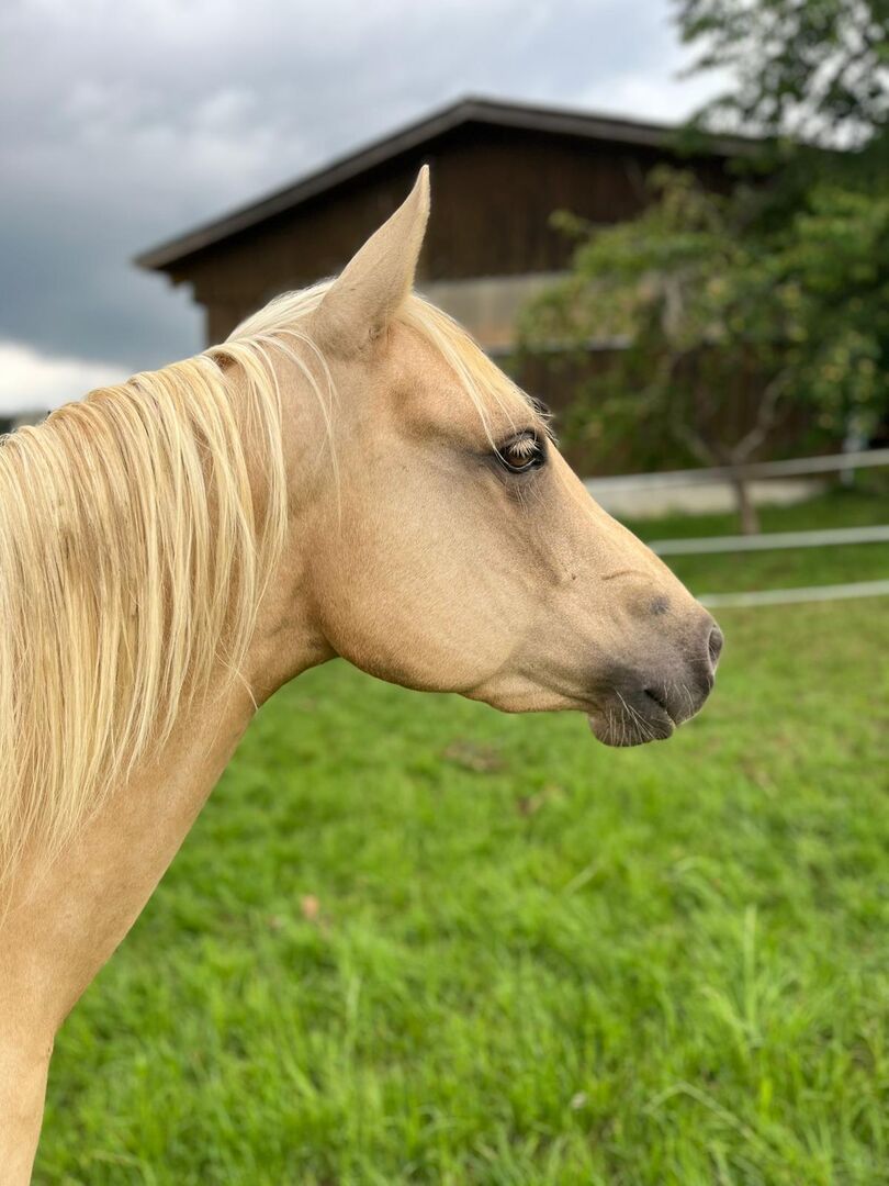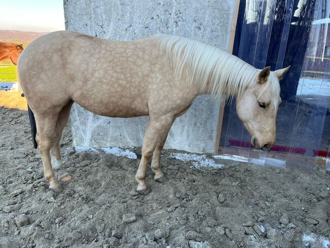 Ein echter Eyecatcher mit Charakter, Qualität und Zukunftspotenzial! Mit ihrer Palominofarbe, ihrem kompakten, kräftigen Körperbau und ihrer sehr guten Bemuskelung zieht Mobsters Trashya sofort alle Blicke auf sich. Die am 18.04.2022 geborene Quarter Horse Stute misst aktuell etwa 145 cm , ist korrekt gebaut, gesund und überzeugt mit einem hochwertigen Reiningpedigree (HF Mobster x Gunnatrashya). Beste Voraussetzungen für eine erfolgreiche sportliche Zukunft oder einen anspruchsvollen Freizeitpartner. Maggie besitzt einen lieben, menschenbezogenen und verschmusten Charakter. Sie ist zutraulich, brav und im täglichen Umgang unkompliziert, braucht jedoch klare Regeln und eine konsequente, faire Förderung. Als intelligente junge Stute möchte sie regelmäßig gearbeitet und geistig wie körperlich gefordert werden. Unregelmäßige Arbeit macht sie auf Dauer nicht glücklich. Aufgrund ihres Alters und Ausbildungsstandes ist sie daher kein Anfängerpferd, sondern ideal für ambitionierte Reiter, die Freude daran haben, ein talentiertes Nachwuchspferd weiter auszubilden. Die Stute ist leicht angeritten und war bereits mehrere Male im Gelände unterwegs. Tierarzt und Hufschmied kennt sie selbstverständlich. Sie lebt aktuell in Robusthaltung im Offenstall, kennt die Herdenhaltung, ist geimpft und regelmäßig entwurmt. Maggie ist 6-Panel n/n über ihre Eltern. Mit ihren guten Gangarten, ihrer Motivation und ihrem starken Fundament bringt sie viel Potenzial für den Turniersport mit. Sie ist in das EWU Jungpferdeprogramm einbezahlt. Ebenso ist eine doppelte Registrierung (AQHA und APHA) möglich. Ob als zukünftiges Showpferd oder als hochwertiger Freizeitpartner mit Perspektive - dieser Youngster ist ein echtes Versprechen für die Zukunft.