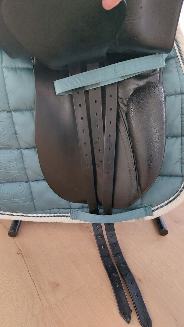 Der Sattel verfügt über 3 Strupfen (2x lang ,1x kurz), so dass er mit einem kurzen Dressurgurt oder auch einem Langgurt geritten werden kann. Ich selbst reite gern mit Langgurt.
