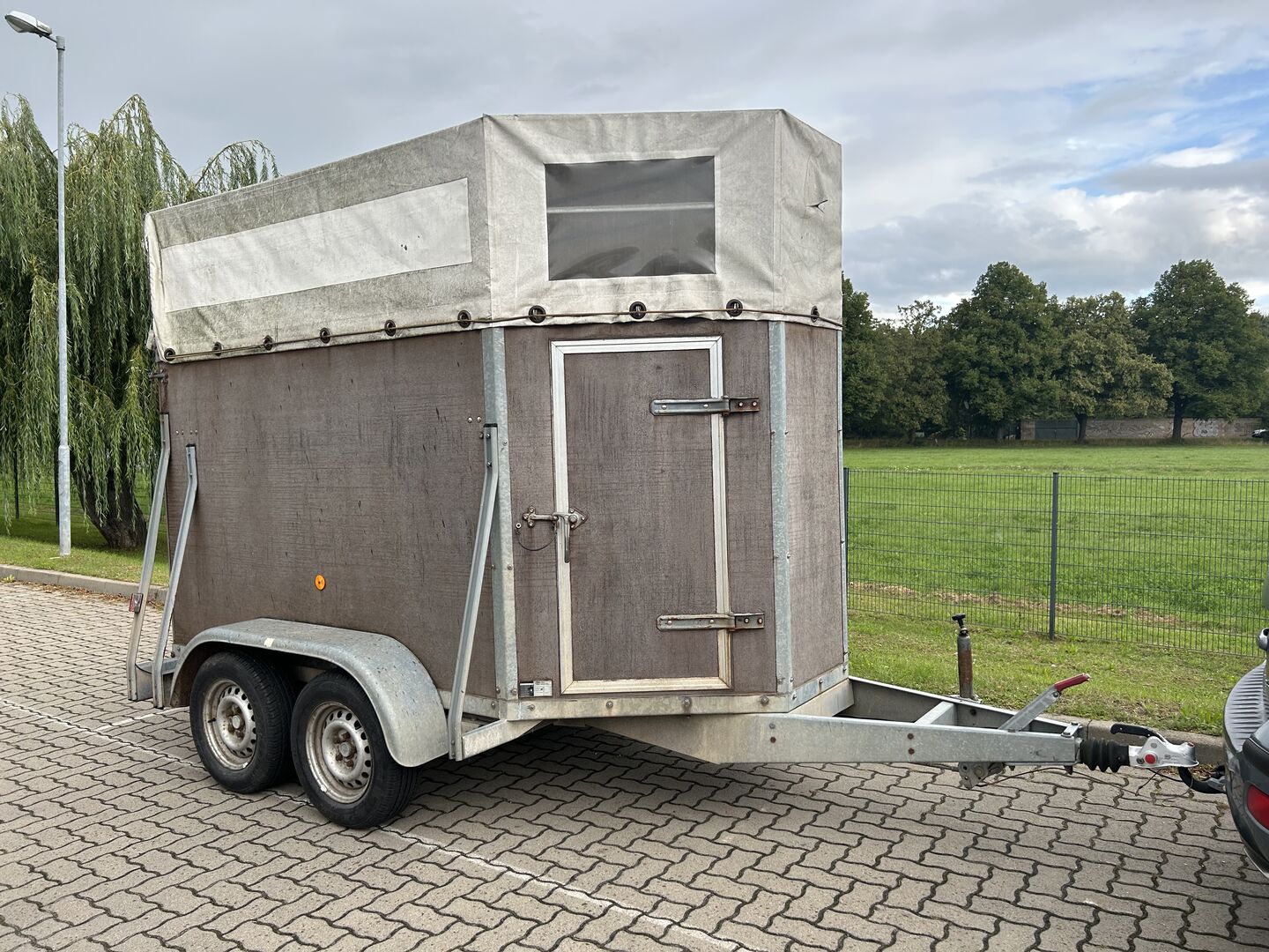 Verkaufe mein treuen Pferdeanhänger. Leider sind wenige Löcher in der Plane und somit der vordere Boden nass. TÜV seid Oktober 2023 abgelaufen. Man müsste den Boden und die Plane erneuern. Stoßdämpfer fehlen an der Klappe hinten, hat mich aber nicht gestört.