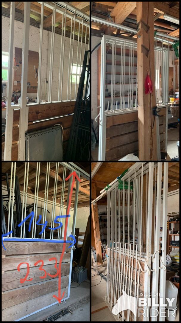 Update: Die Toren wurden schon abmontiert. Für 2 Toren fehlen die Schienen. Zwischenwand war aus Holz mit Metall Halterung, Halterung ist dabei. Alle 3 Toren zusammen kostet 1300 Euro. 2 neue Tränke sind auch Gratis dabei.